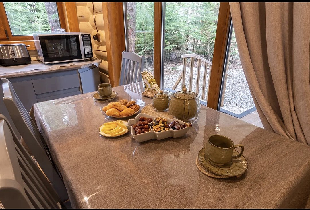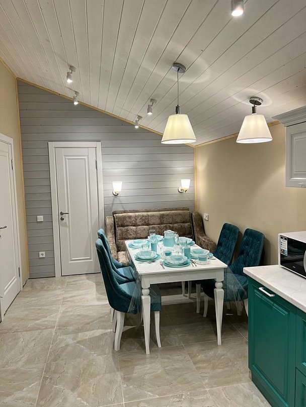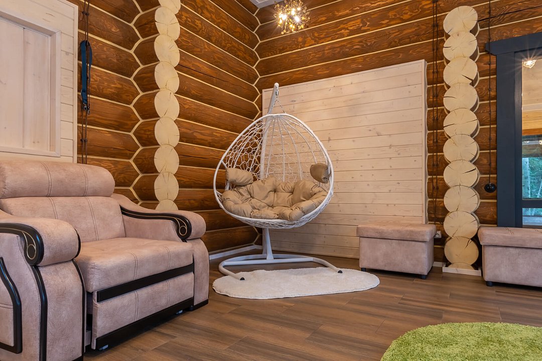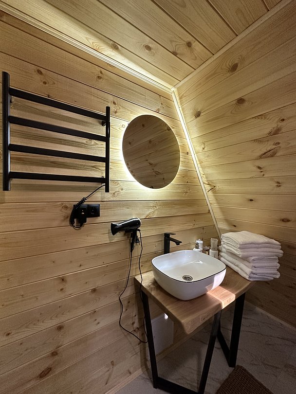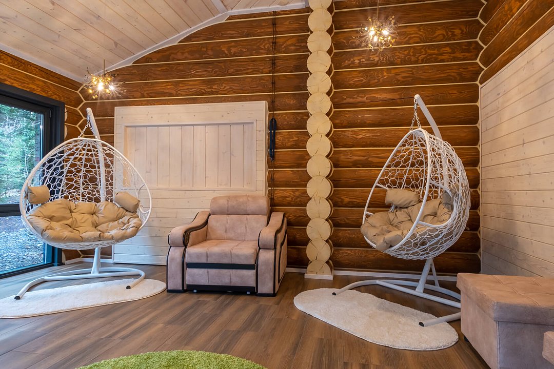 Интерьер комплекса выполнен в дизайнерском стиле с использованием качественных материалов и приятных мелочей, которые делают отдых особенно уютным. Просторная гостиная и комната отдыха обеспечивают комфортное пространство для общения и релаксации. Для удобства гостей предусмотрен санузел и душевые обливные устройства.