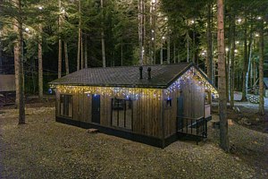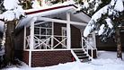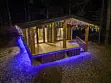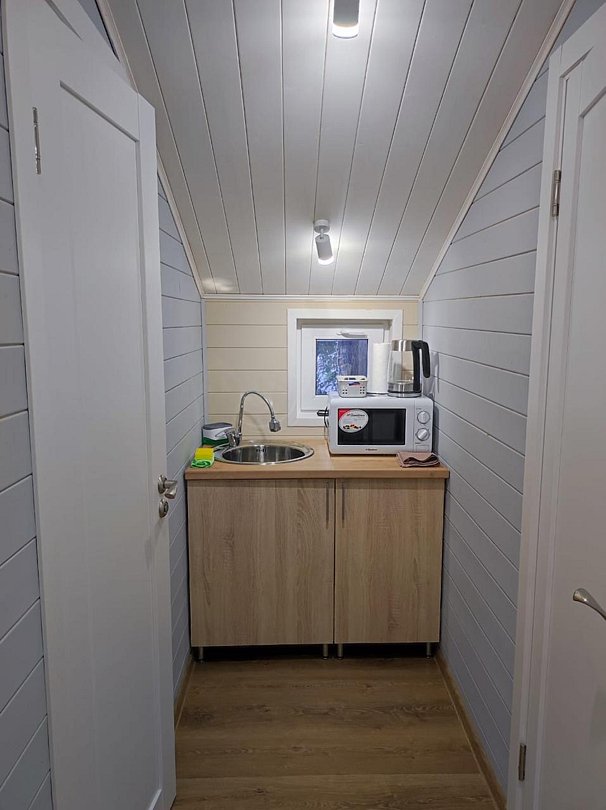 Комфортный эко-дом с двумя спальными комнатами с двуспальными кроватями, гостиной с двухместным раскладным диваном, просторной прихожей с кухонной зоной и панорамными окнами, террасой и беседкой.