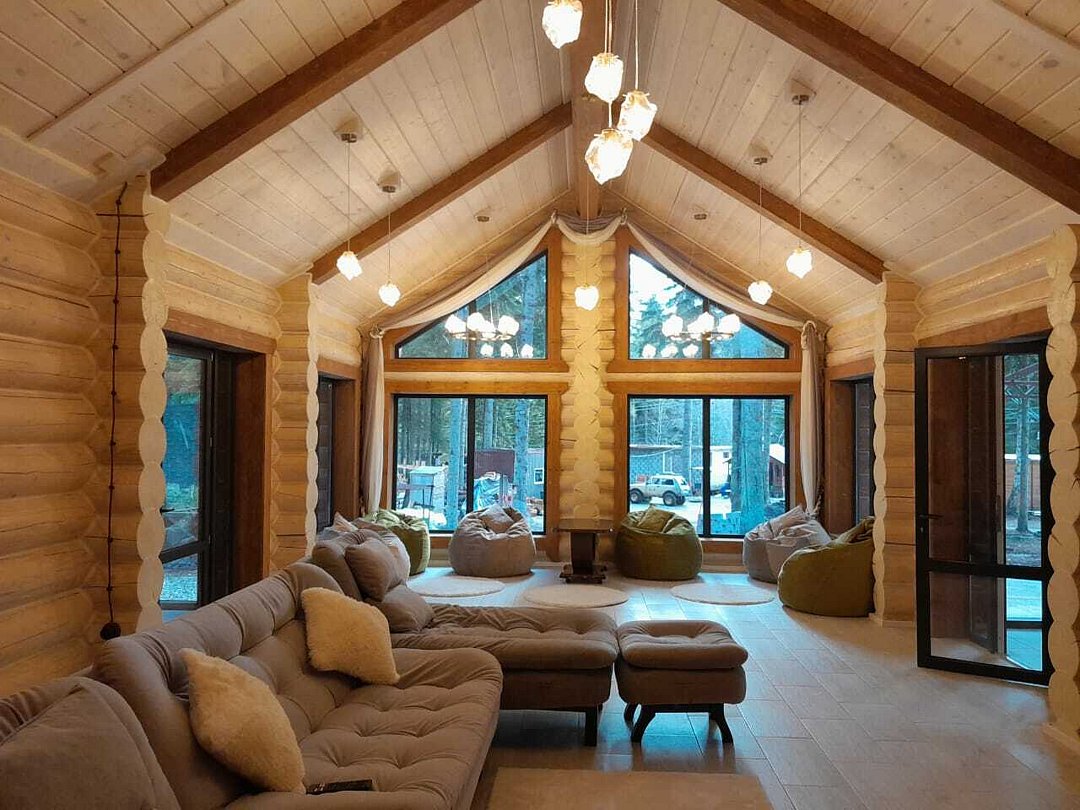 Просторный эко-дом с двумя спальнями с двуспальными кроватями и двухместными раскладными диванами, спальней с двуспальной кроватью, грандиозной гостиной с двухместным раскладными диваном и двумя раскладными креслами, лаунж-зоной с качелями и двумя раскладными креслами, полноценной кухней, открытыми террасами и беседкой.