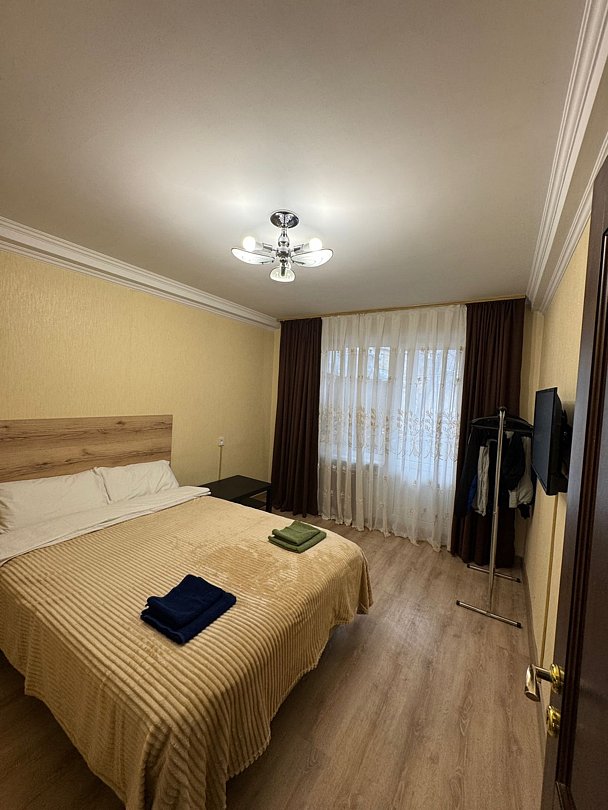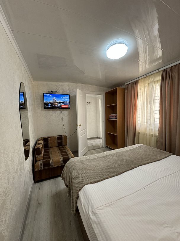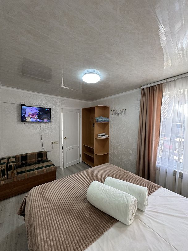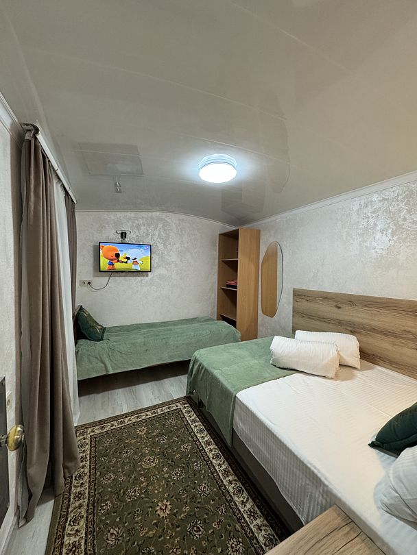 Две изолированные комнаты: в каждой комнате по 2 кровати, ТВ-цифровое, wi-fi, диван, санузел (душевой поддон), мини-кухня с посудой, газовая печь, микроволновка, эл.чайник, холодильник, стол.