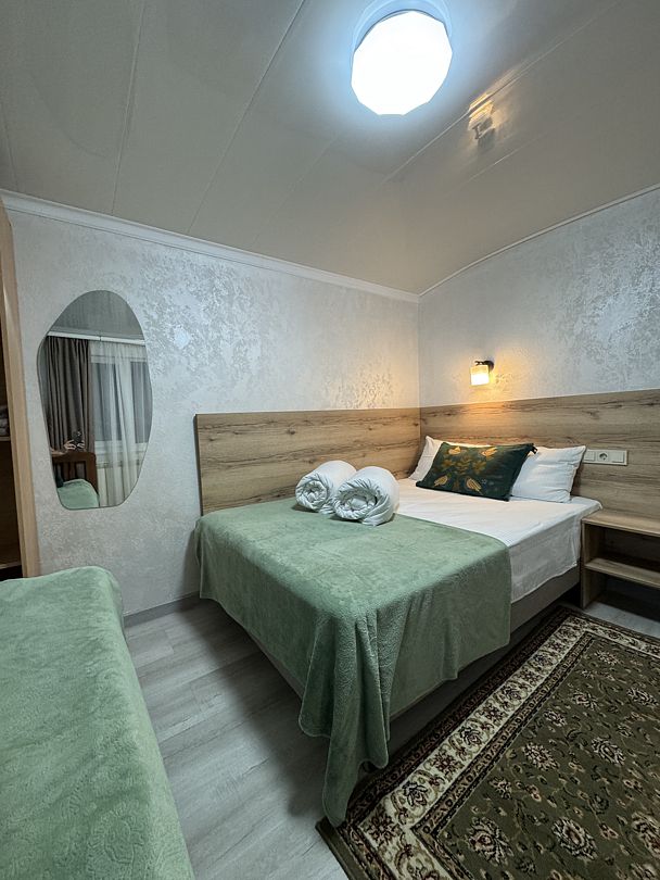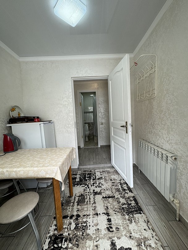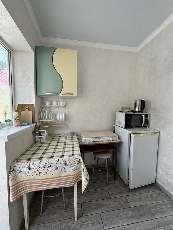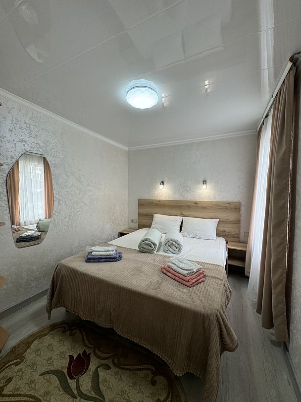 Путешествие с семьейГостеприимноНебольшой уютный отель. Закрытая территория, хозяйка Марина очень гостеприимная. Подает изумительные хычины. У нас был номер на 4. Две отдельные комнаты с хорошими двухспальными кроватями. Идеально чистое постельное белье (что для меня не мало важно). В номере есть холодильник, плита, эл. чайник, посуда т.е все необходимое. Можно заказывать еду у хозяйки. Её лагман вкуснейший из тех, что я ела. Очень советую попробовать.