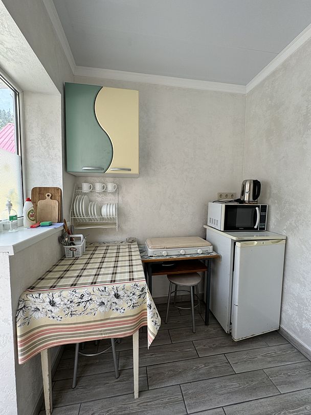 Комната: 2 отдельные кровати или одна двухспальная, ТВ-цифровое, wi-fi, диван, санузел (душевой поддон), мини-кухня посудой, газовая печь, микроволновка, эл.чайник, холодильник, стол.
