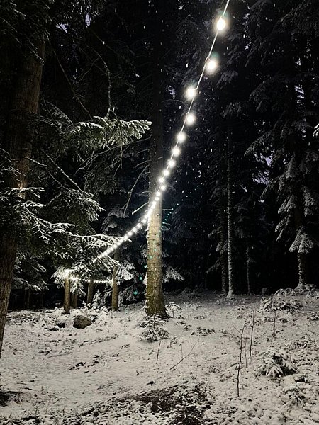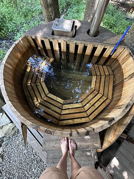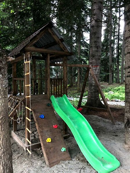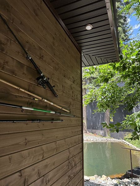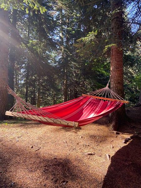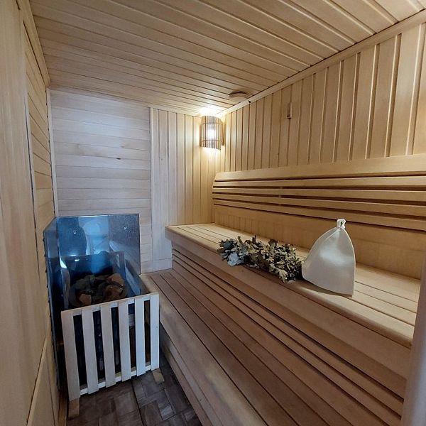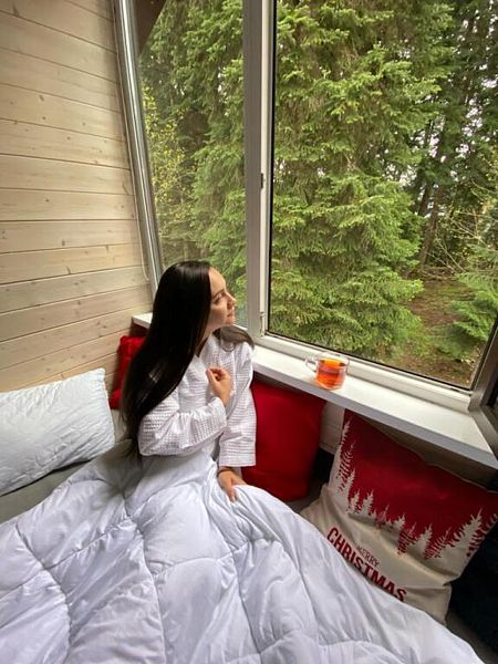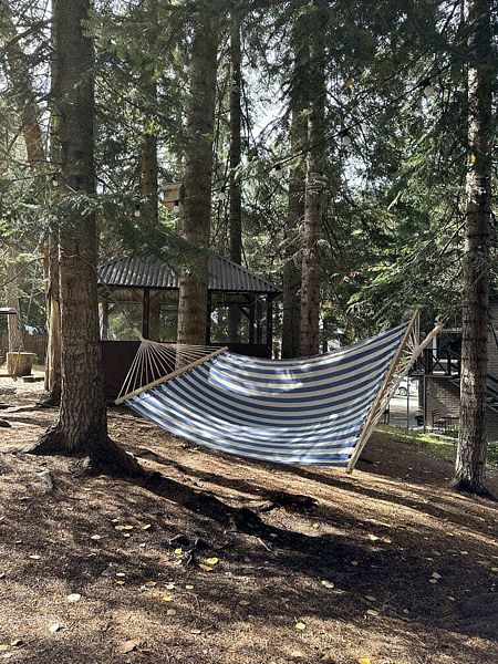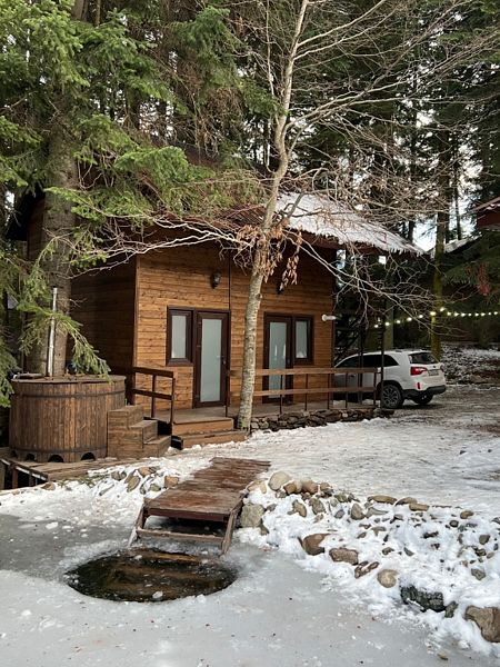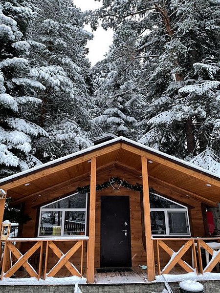 На территории есть зоны с отдыха с качелями, беседками и гамаками, а также специальное форелевое озеро, на котором можно порыбачить и прорубь, чтобы окунуться после посещения бани.