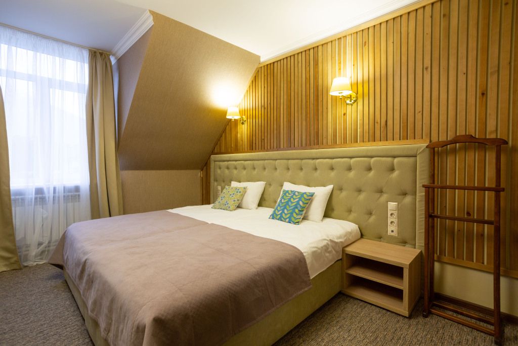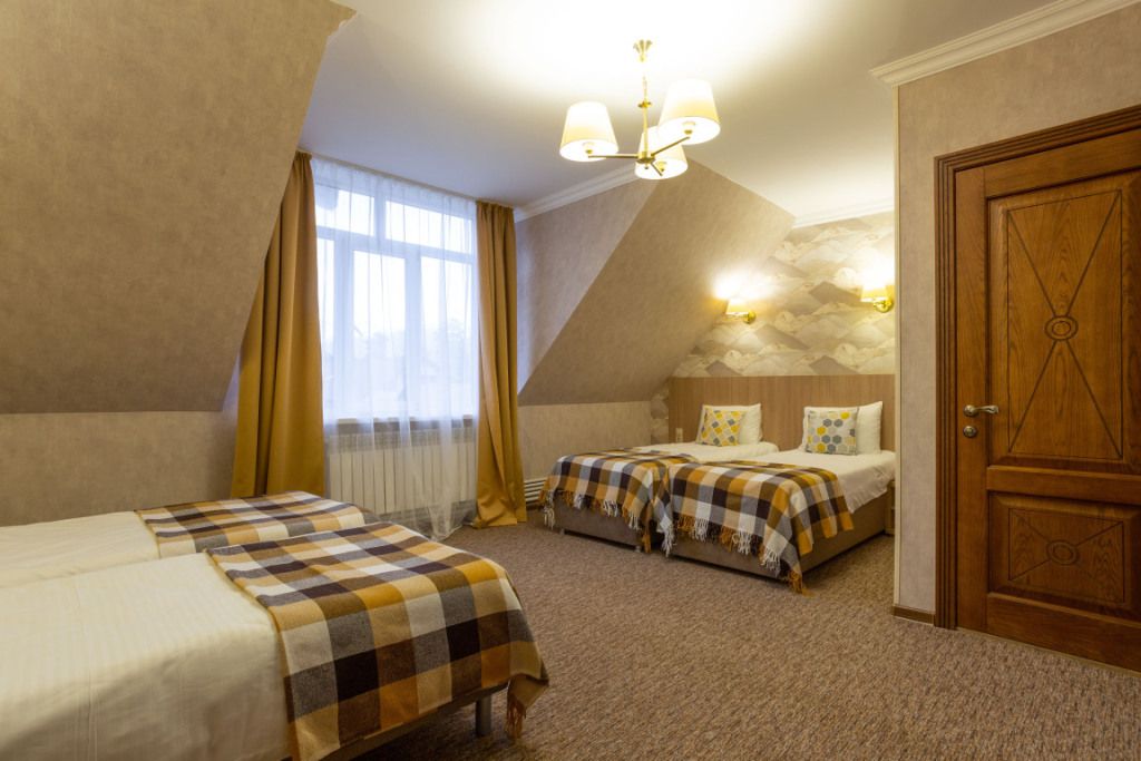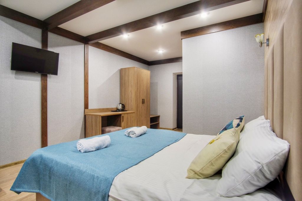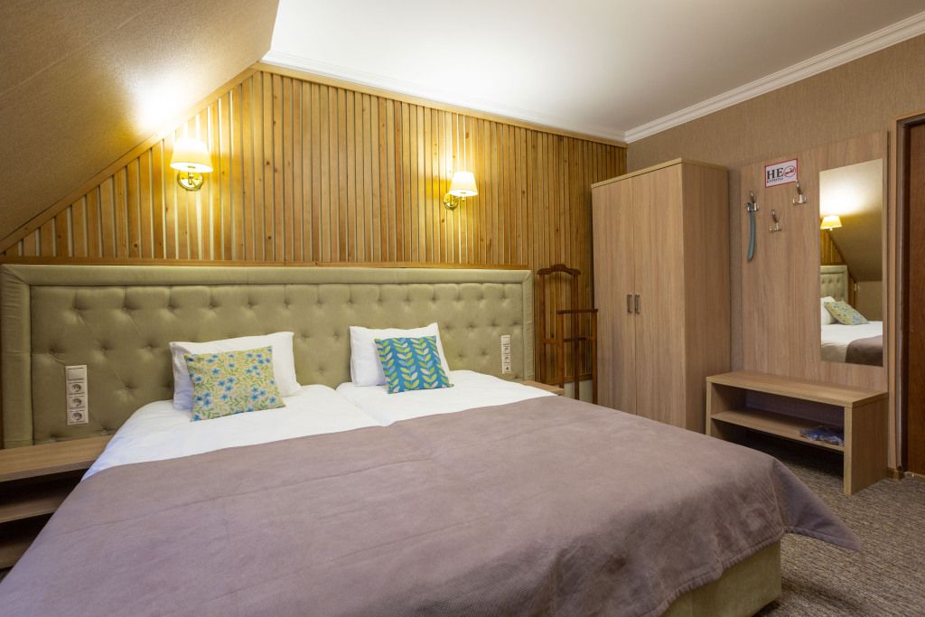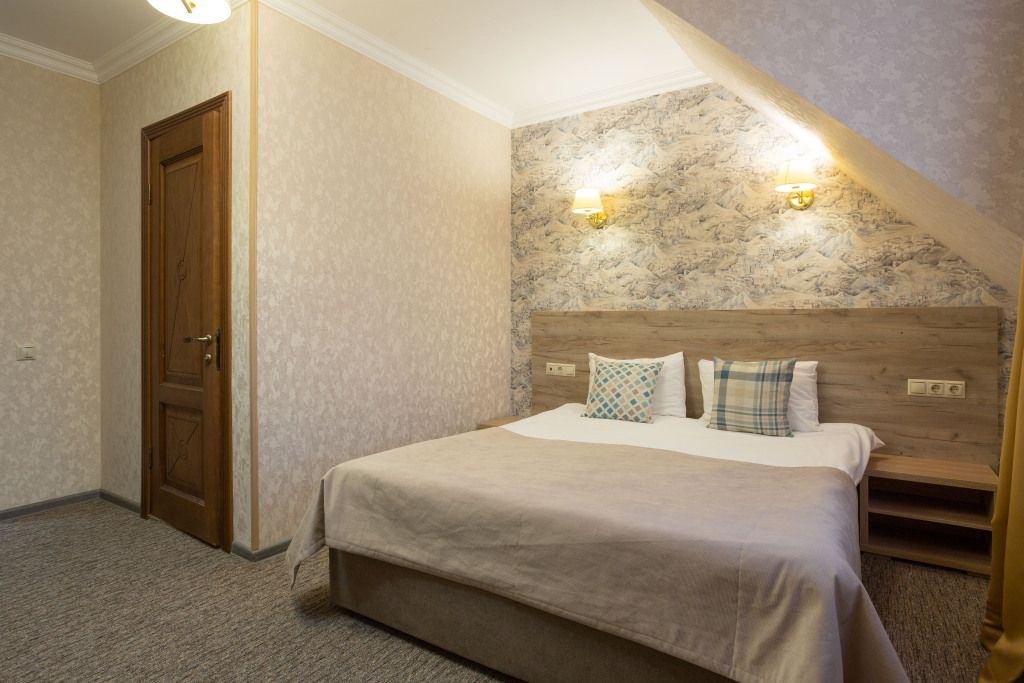 Двухэтажный корпус отеля с мансардным этажом разместился недалеко от центральной улицы поселка — улицы Ленина. Гостей ожидают двухместные номера Стандарт Twin и Double, Семейные номера и Делюкс. Каждый из них оснащен собственным санузлом с душем, есть телевизор, холодильник. Во всех комнатах стильный лаконичный интерьер.