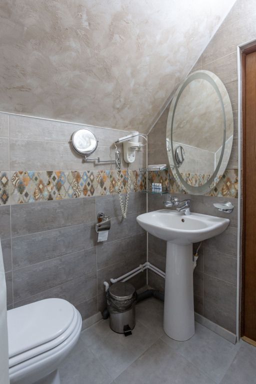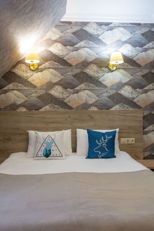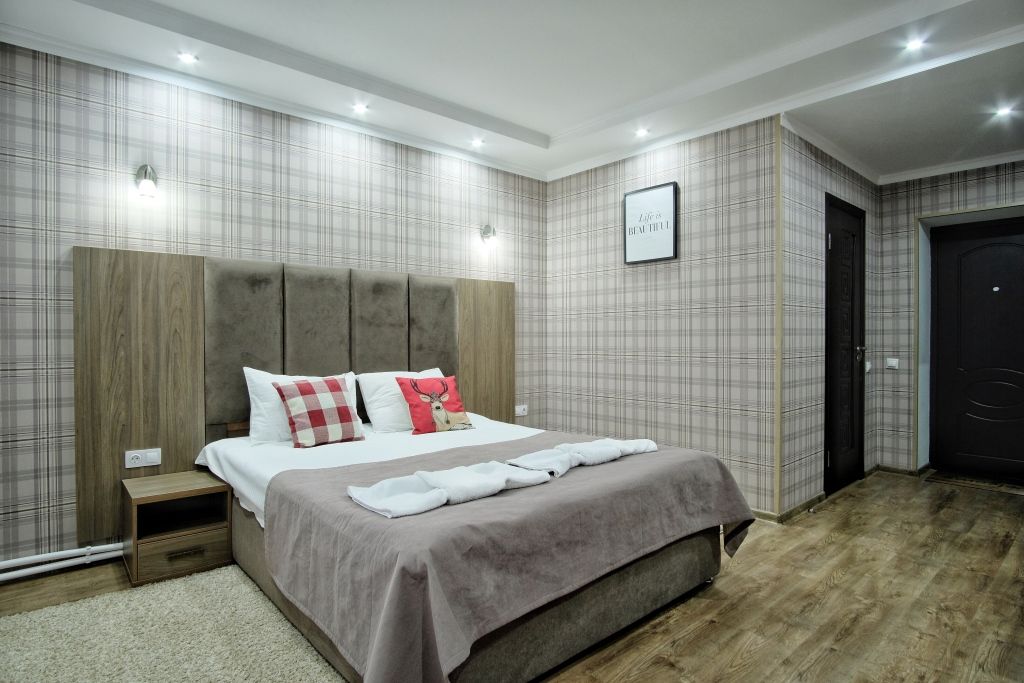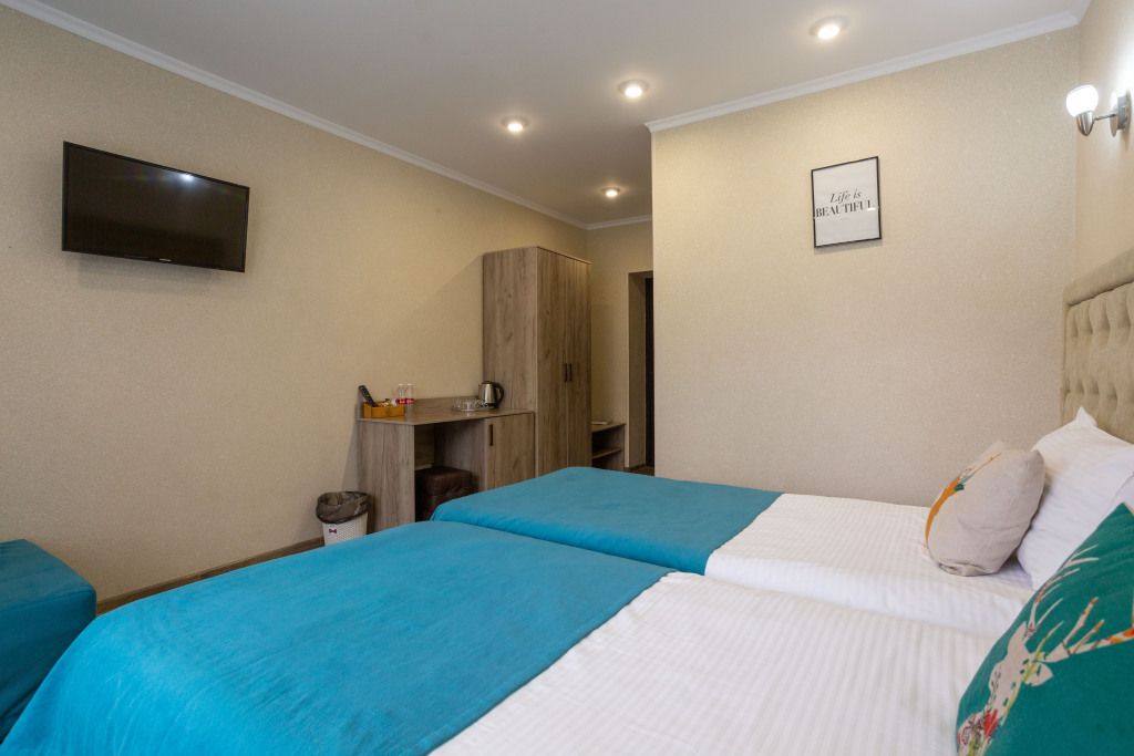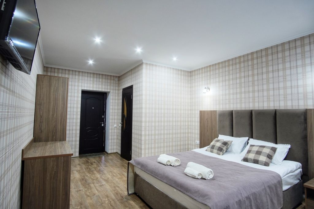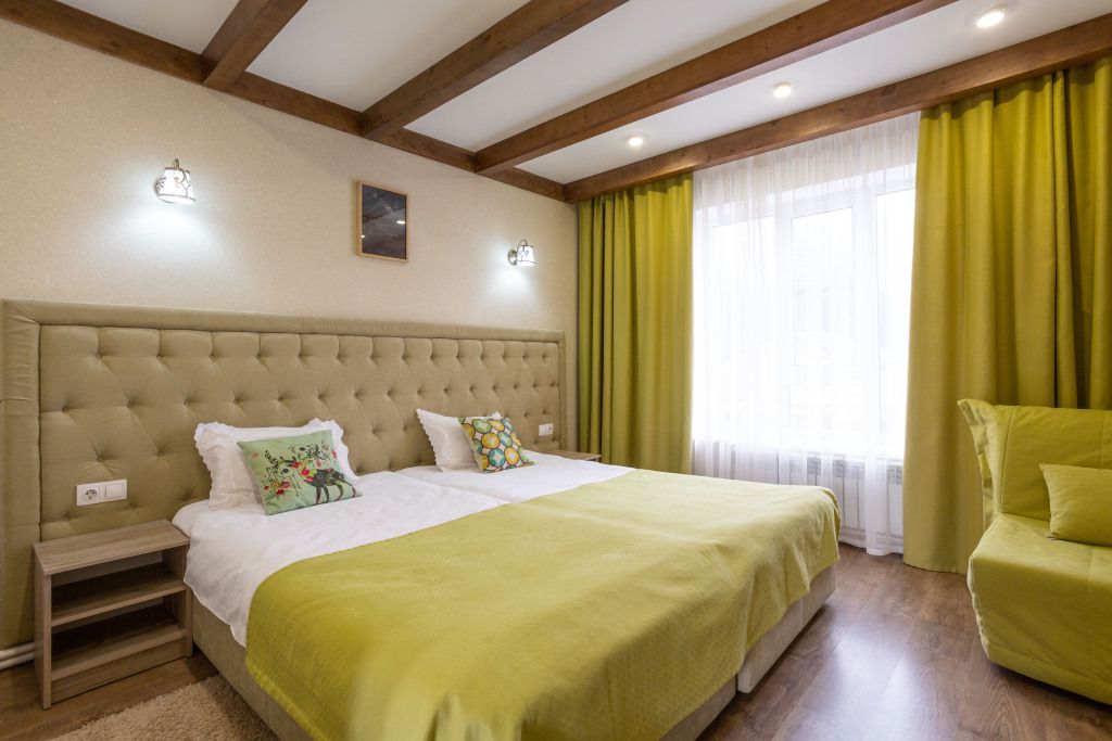 Двухэтажный корпус отеля с мансардным этажом разместился недалеко от центральной улицы поселка — улицы Ленина. Гостей ожидают двухместные номера Стандарт Twin и Double, Семейные номера и Делюкс. Каждый из них оснащен собственным санузлом с душем, есть телевизор, холодильник. Во всех комнатах стильный лаконичный интерьер.