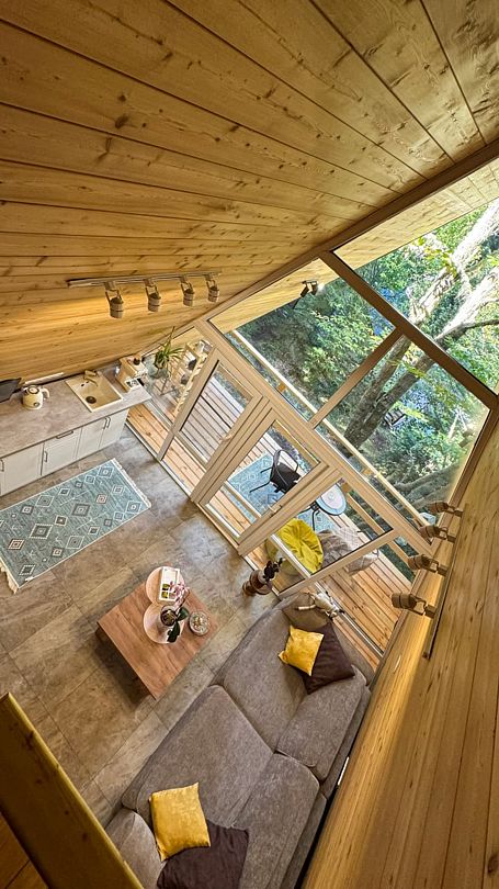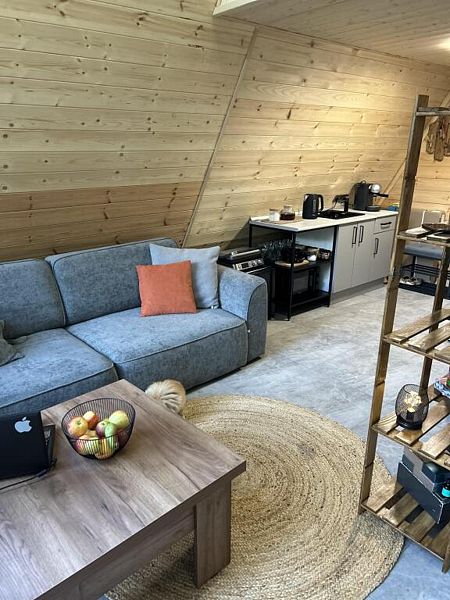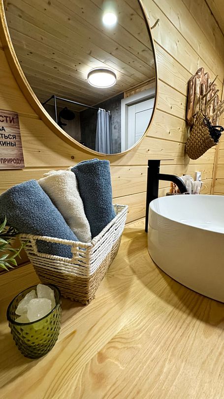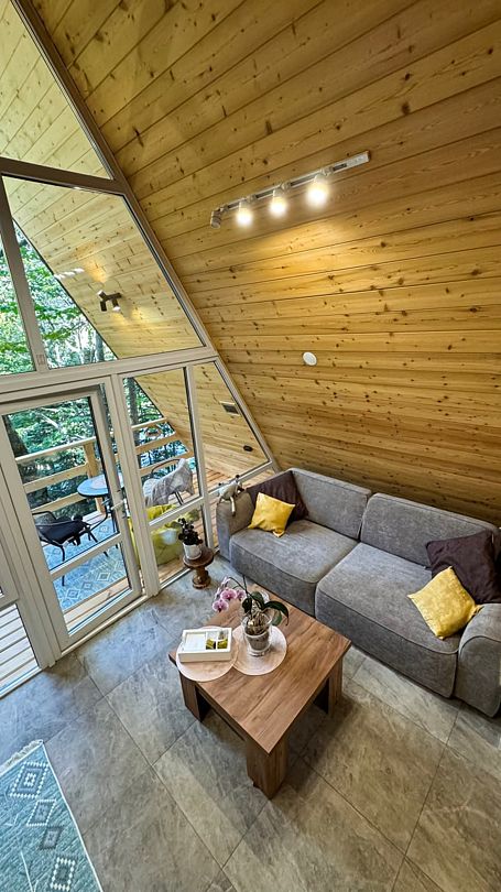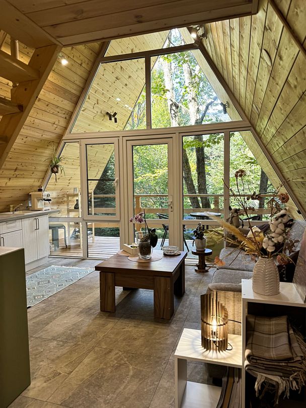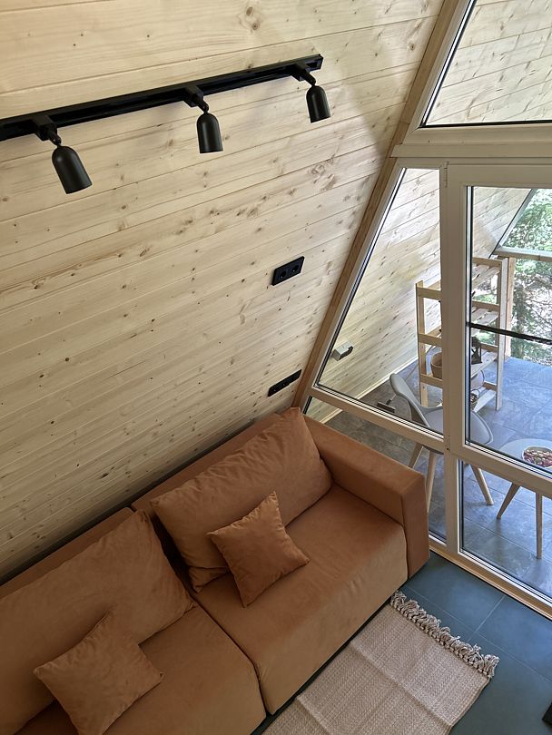 Новый уютный дом в стиле А-фрейм с отдельной спальней и вторым светом, так же есть двуспальное место на антресоли. В кухни-столовой удобный раскладной диван,всего 6 спальных мест. Дом оборудован всем необходимым для жизни. В кухонной зоне есть холодильник, микроволновая печь, индукционная печь, кофемашина, электрический чайник, столовые приборы, турецкий фарфоровый сервис, чайные и кофейные чашки, набор кастрюль и сковорода, телевизор с Алисой и интернет, парковка.