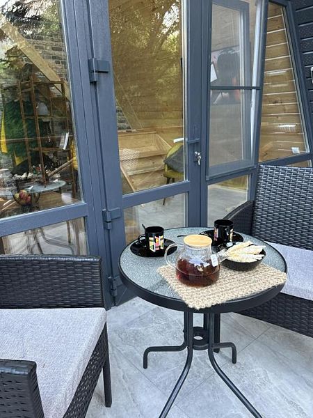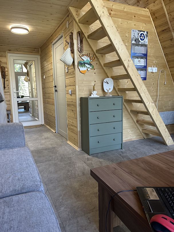 Дом-студия со всеми удобствами в двух уровнях. Антресоль с двумя раздельными спальными местами 90\200 или одним двуспальным 180\200. Дом оборудован кухонной зоной со всем необходимым (посуда, столовые приборы, чайник, микроволновая печь, холодильник).