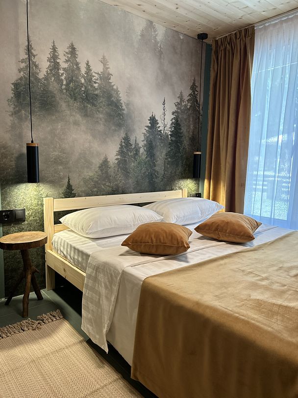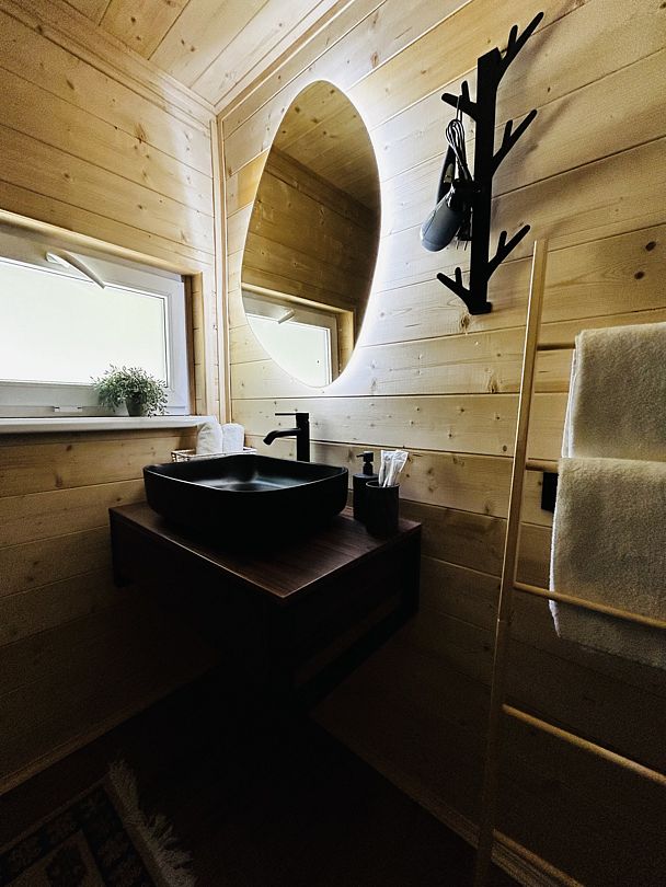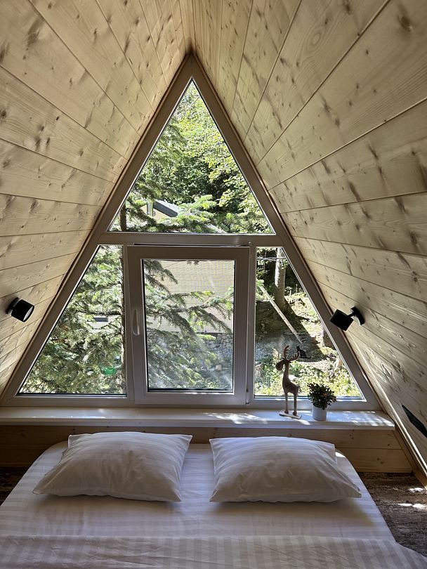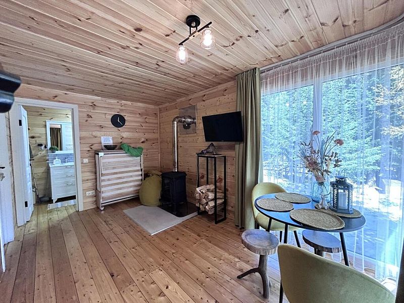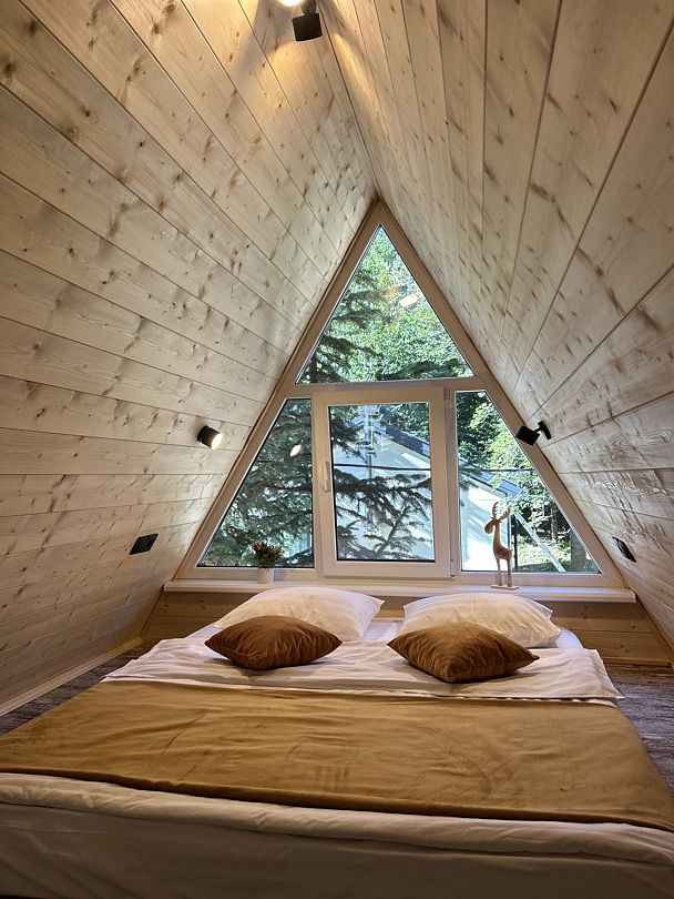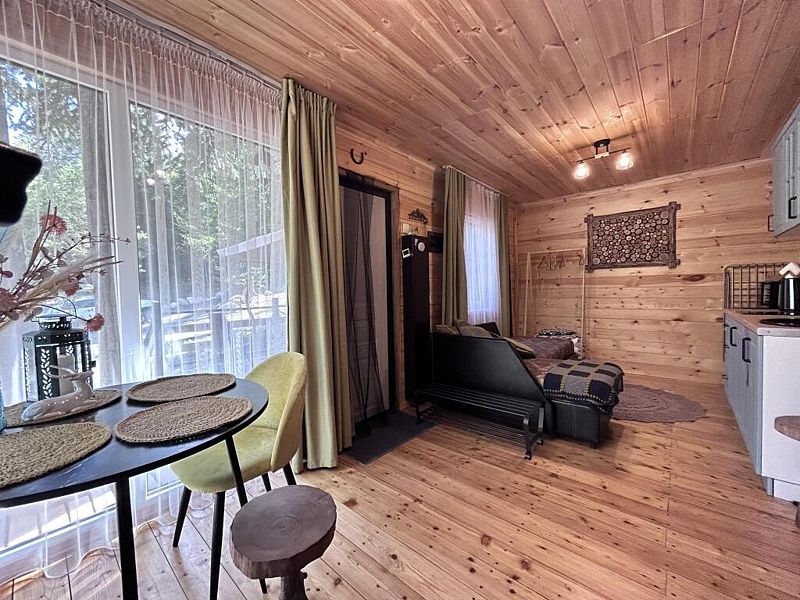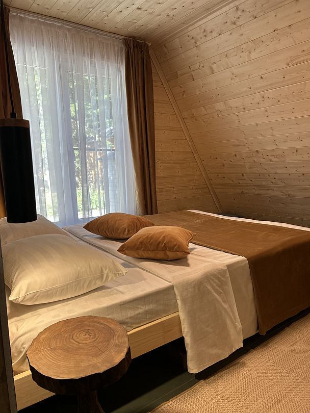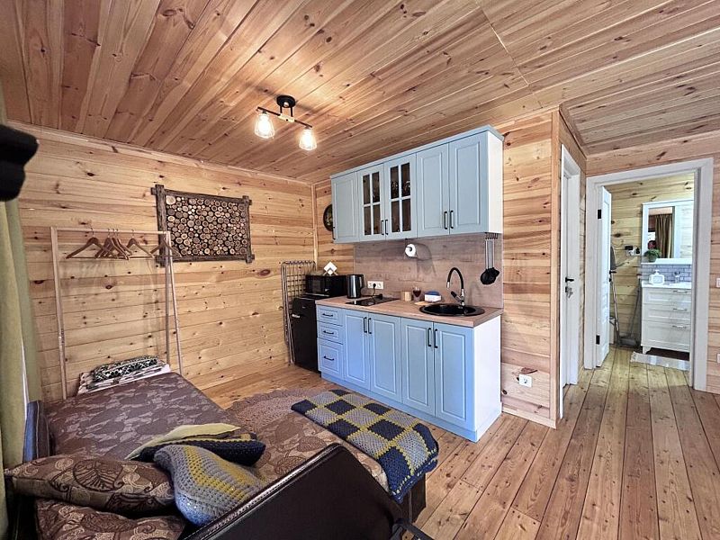 Вам доступен номерной фонд, включающий в себя 1 уютный домик типа Шале и 2 прекрасных домика типа А-фрейм. Каждый домик оборудован кухней, где вы найдёте всё необходимое для приготовления вкусных блюд — холодильник, чайник, плиту и кухонную утварь. И чтобы ваше пребывание было максимально комфортным, у каждого домика есть собственная ванная комната.