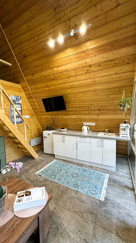Дом-студия со всеми удобствами в двух уровнях. Антресоль с двумя раздельными спальными местами или одним двуспальным. Дом оборудован кухонной зоной со всем необходимым.