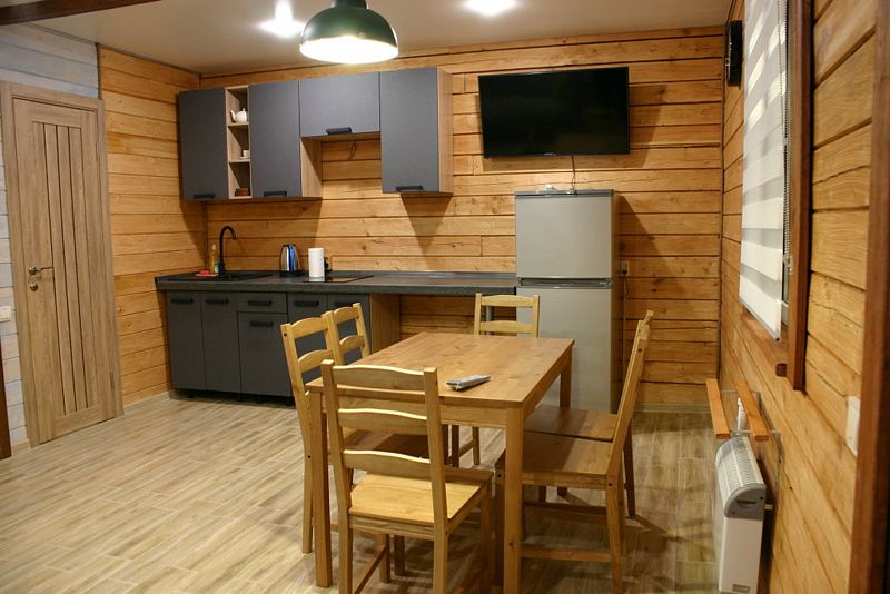 Кухня со всем необходимым доступна в номерах вместимостью 4+.