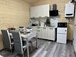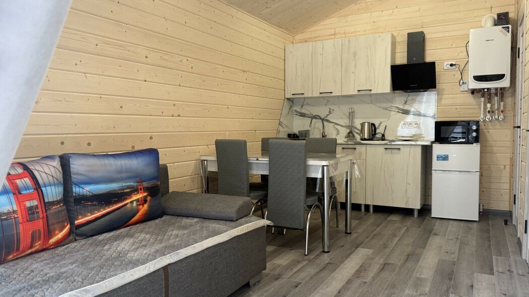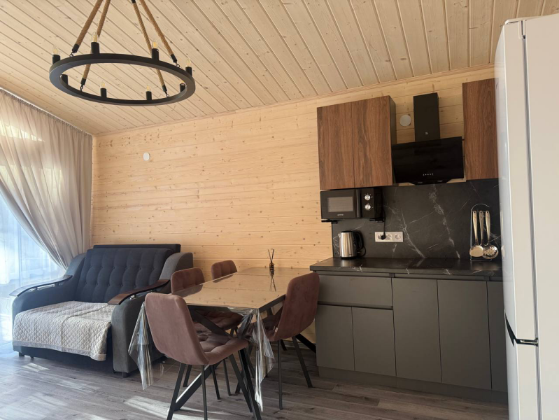 Кухня-гостиная укомплектована всей необходимой техникой и посудой (холодильник, варочная панель, микроволновая печь, вытяжка, чайник), двуспальный диван, телевизор.