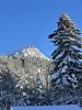 Прекрасный вид на заснеженные горы зимой и густой зелёный лес летом.