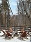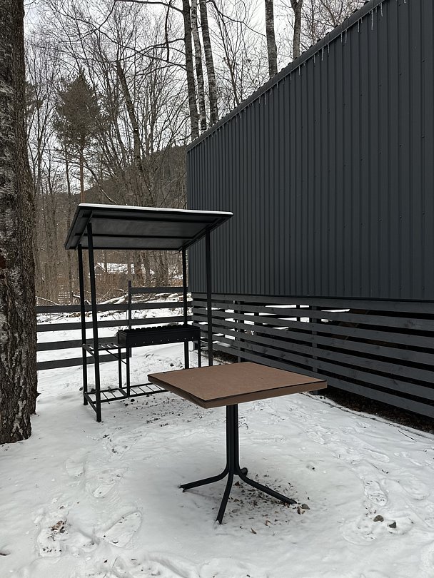 У домика своя терраса с садовой мебелью и мангальной зоной.