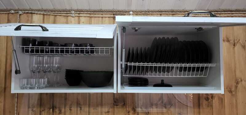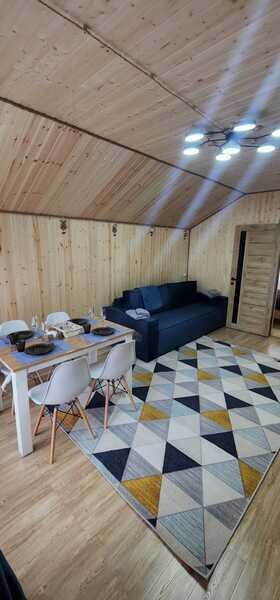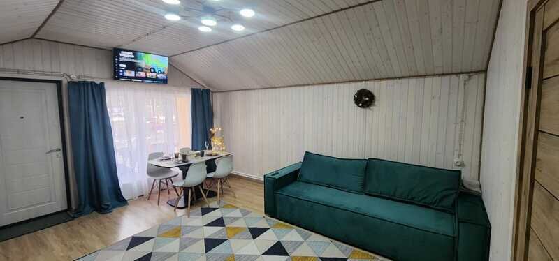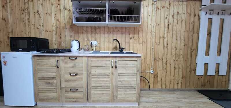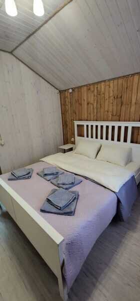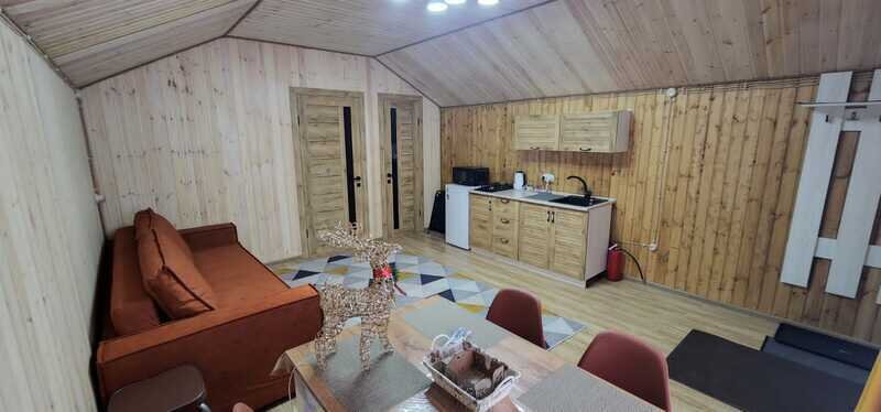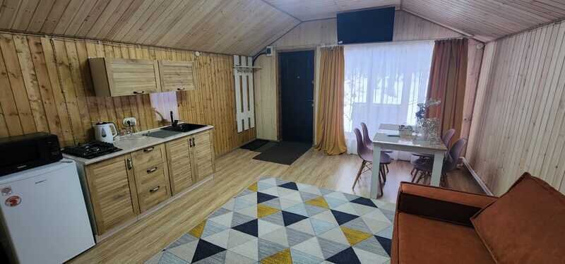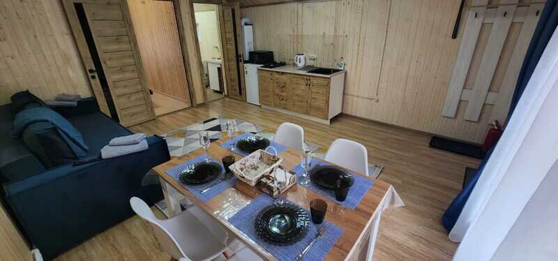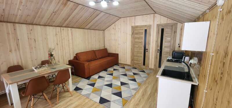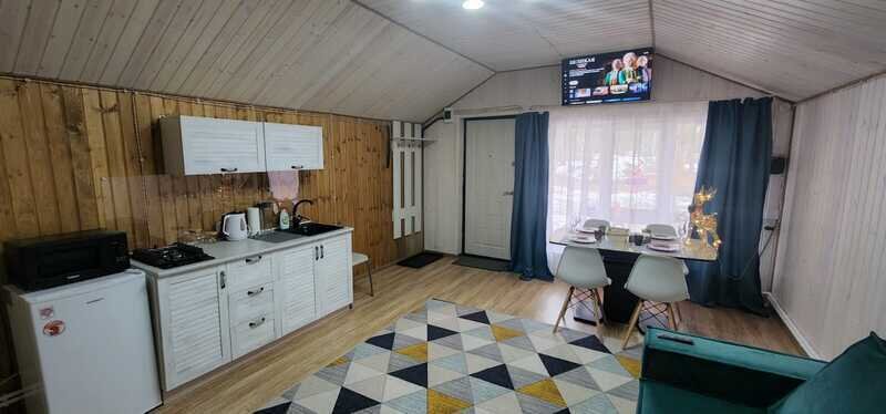 Всего доступны три домика площадью 40 м2 каждый, полностью оборудованные всем необходимым для комфортного проживания. Кухонная зона оснащена газовой плитой, чайником и микроволновой печью. В домиках имеется телевизор со смарт-ТВ. Можно также воспользоваться бесплатным Wi-Fi.