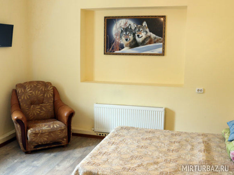 В номере: балкон, двуспальная кровать, прикроватные тумбочки, платяной шкаф. Ванная комната на этаже: душевая кабина, раковина для умывания, туалет. Телевизор установлен в общем холле на этаже.