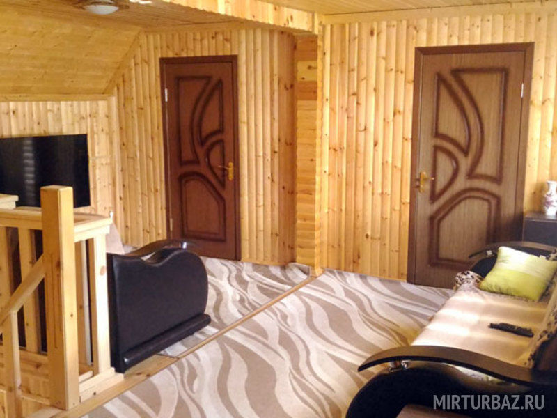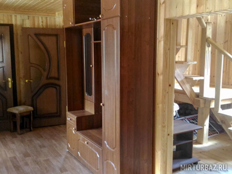 В общем холле второго этажа имеются большой телевизор с плоским экраном, диван, кресло, раскладной стол-тумба. Оснащение коттеджа: кровати, прикроватные тумбочки, столы, стулья, платяные шкафы.