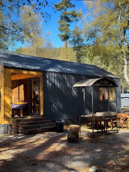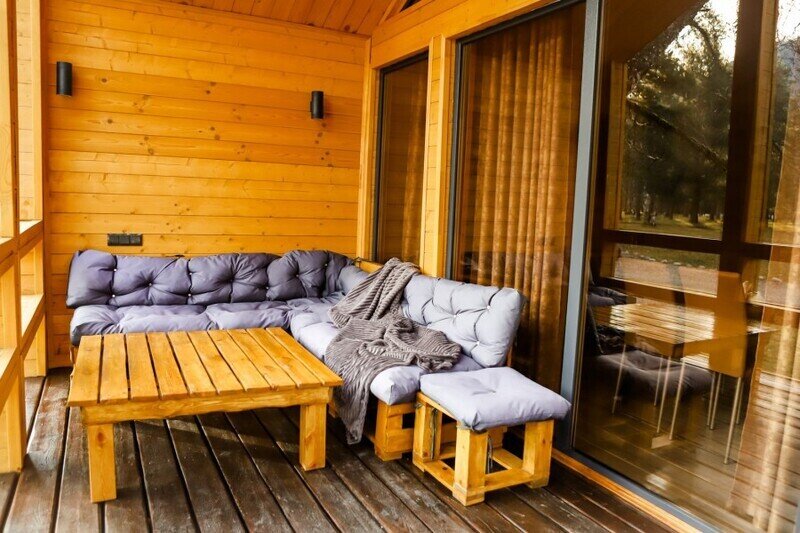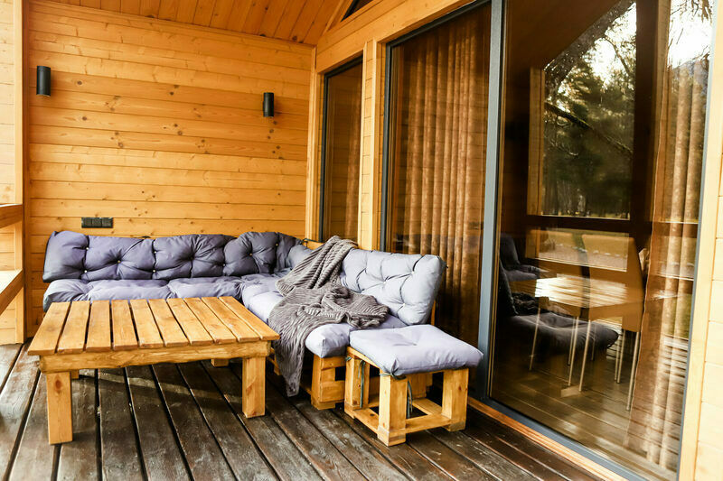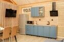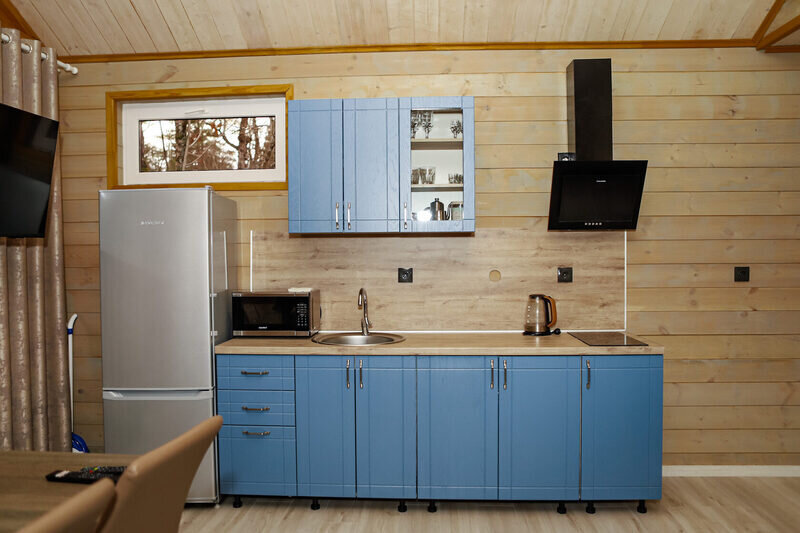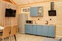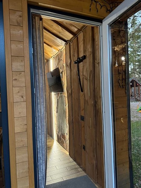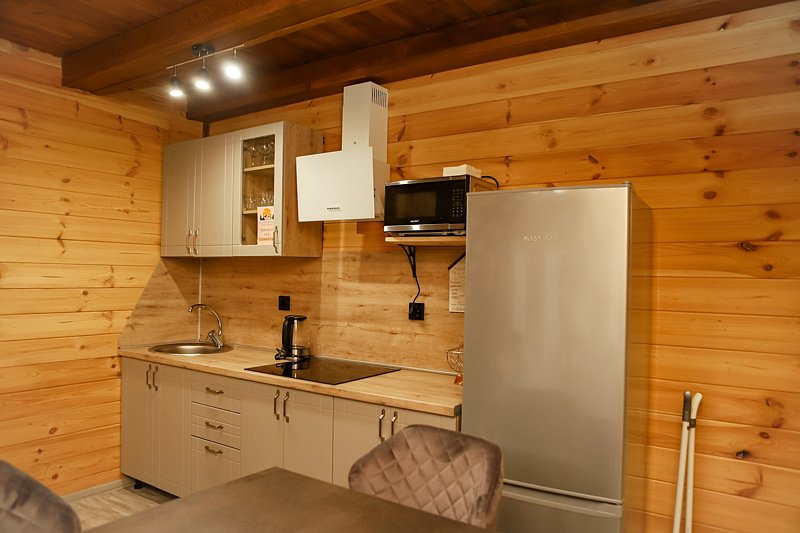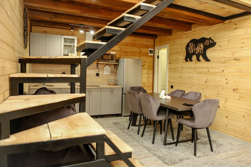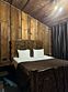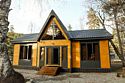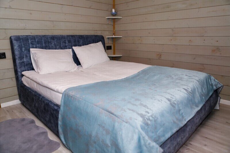 Двухкомнатный дом в эко-стиле, обшитый натуральным деревом, доступен для проживания четырех гостей, со спальней и кухней-гостиной.