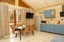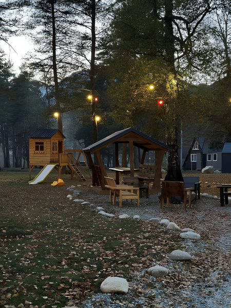 Шале класса люкс предлагает комфортное проживание, каждый домик рассчитан на пятерых гостей. Шале оборудовано мангальной зоной, уличным камином, детской площадкой и беседкой.