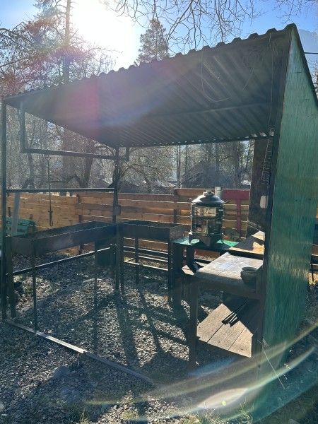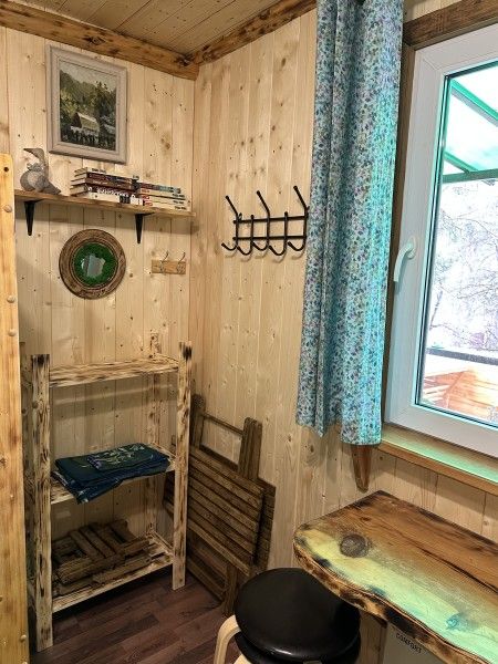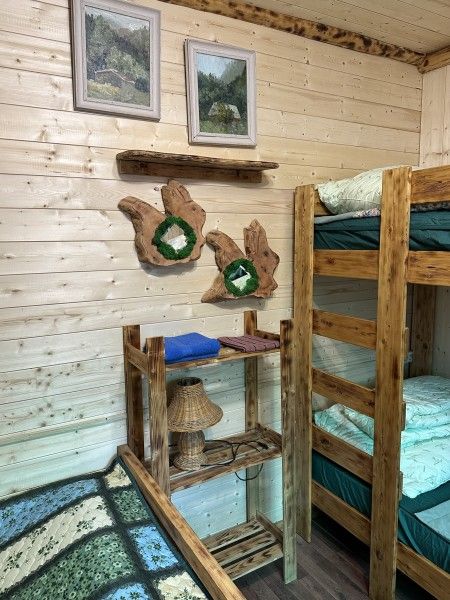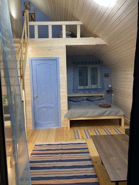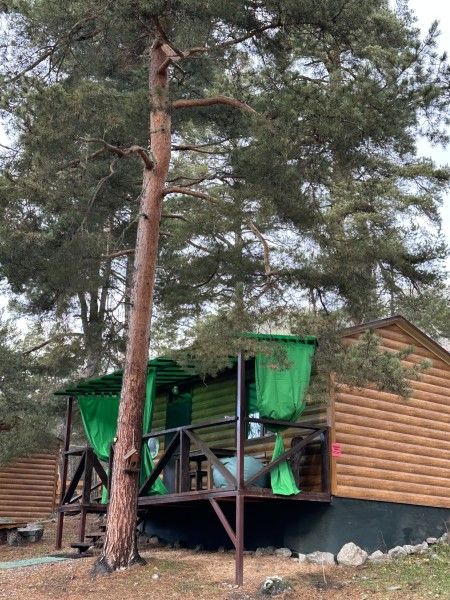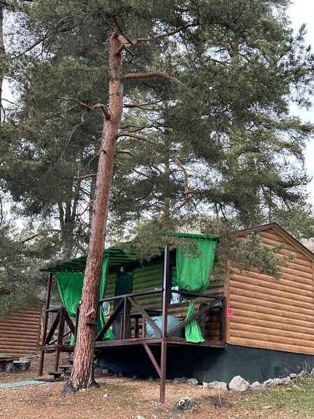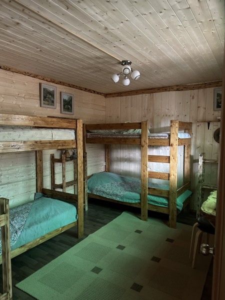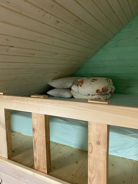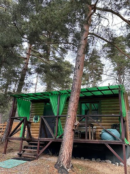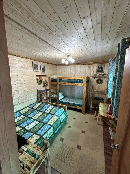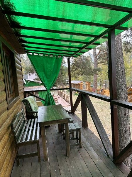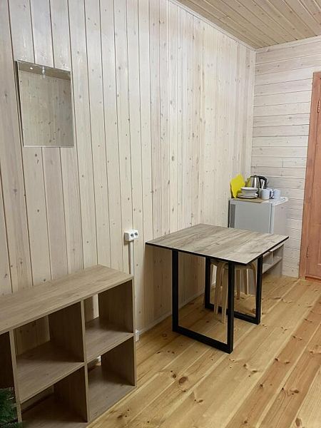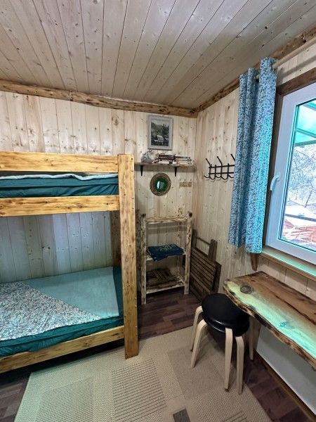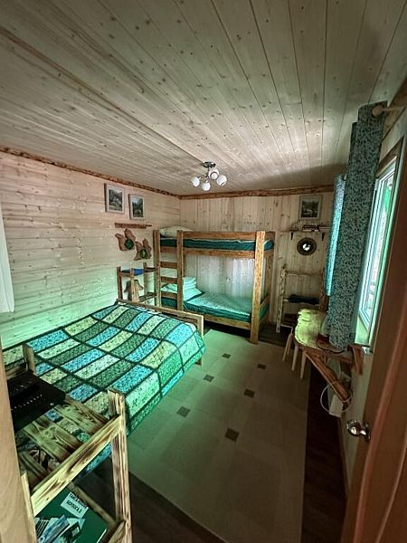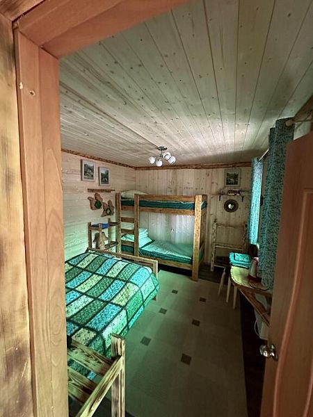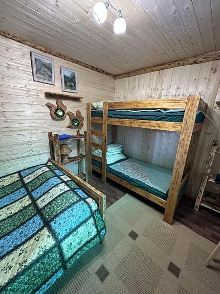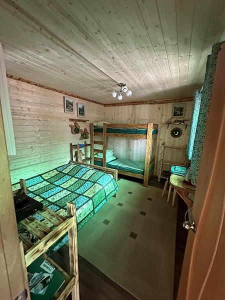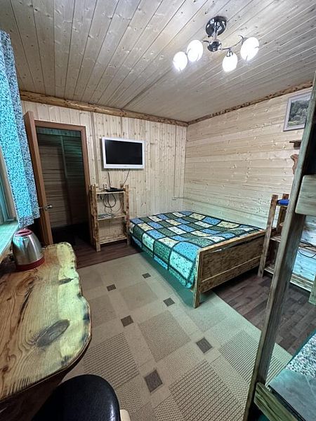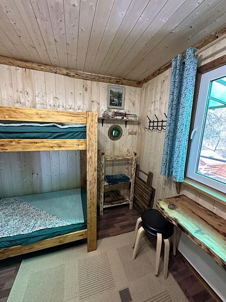 Домик комфорт (Берлога 2 ). Отдельно стоящий домик с верандой. На веранде стол с лавками. Домик с одной двуспальной кроватью и одной двухъярусной кроватью.