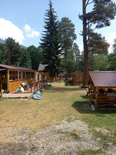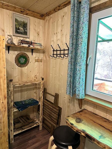 В домике телевизор, небольшой холодильник, электрочайник. Постельное белье и полотенца для лица предоставляются. Банные полотенца по запросу. Санузел: душ, туалет, горячая вода бойлер 100л. Отопление электрическое. С веранды домика открывается красивый вид на горы.