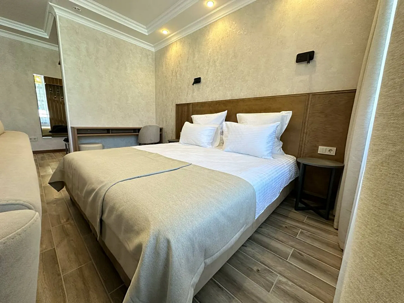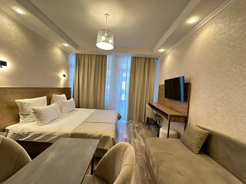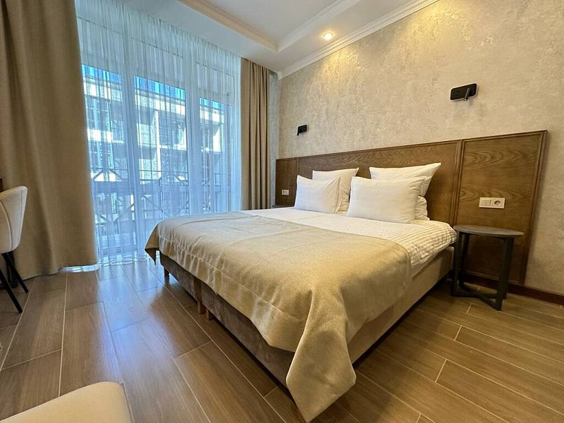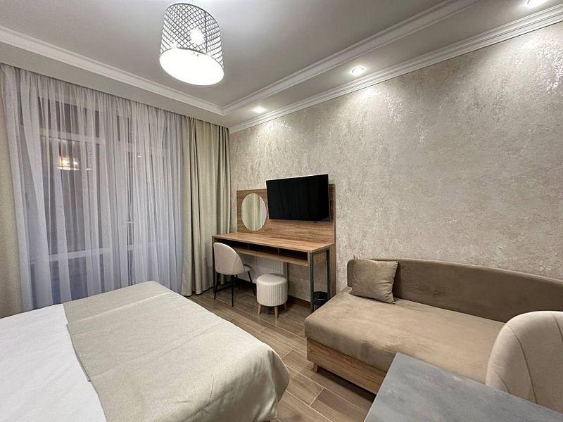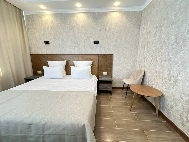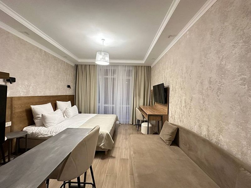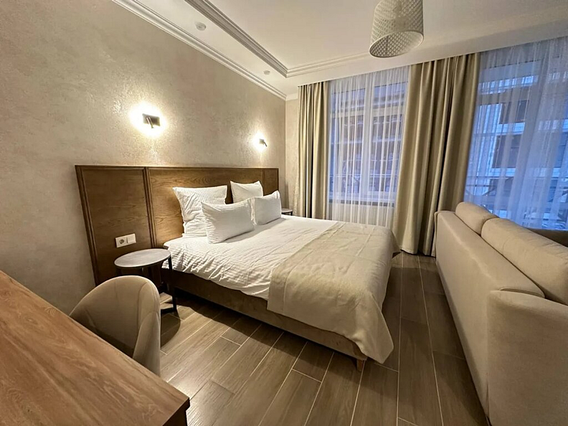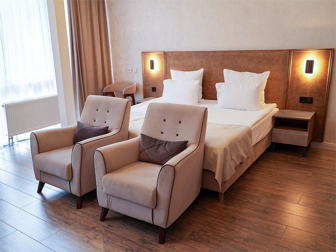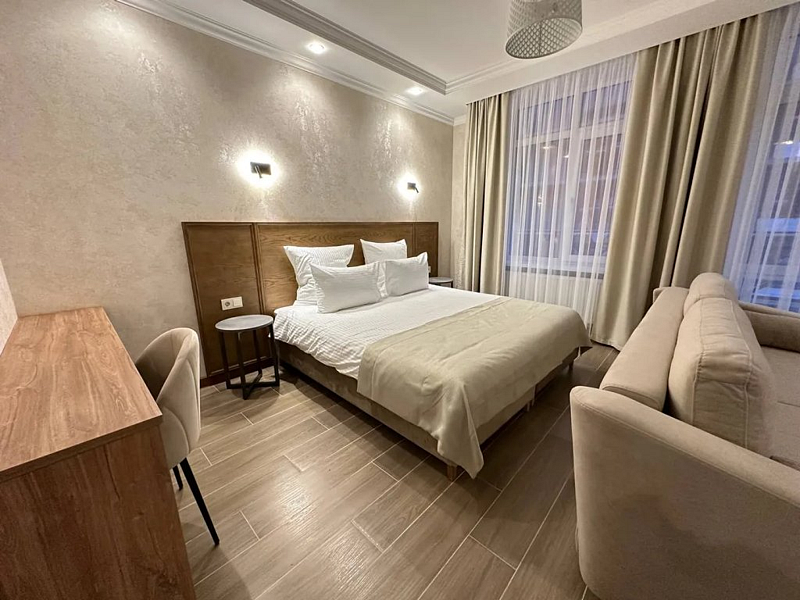Номера категории «Стандарт» оформлены в элегантных нейтральных тонах и отличаются уютной атмосферой. В каждом номере предусмотрено объединённое пространство, включающее зону отдыха и обеденную зону, оснащённую столом и стульями. Также в каждом номере есть просторная кровать и удобный диван. Имеется балкон. Обратите внимание: фотоматериалы являются типовыми. Возможны различия в отделке и комплектации номеров одной категории.Услуги и удобства