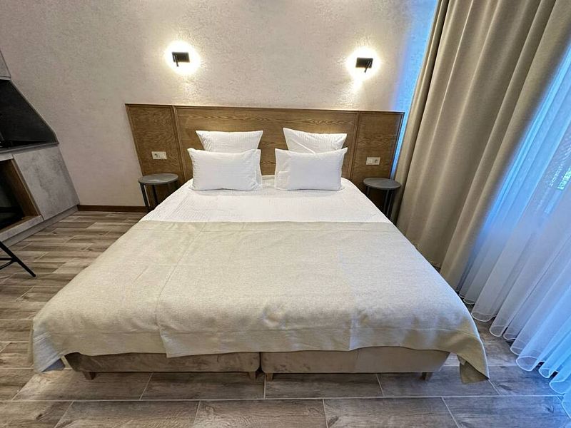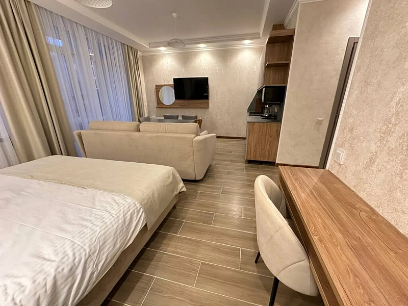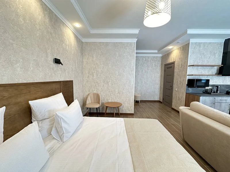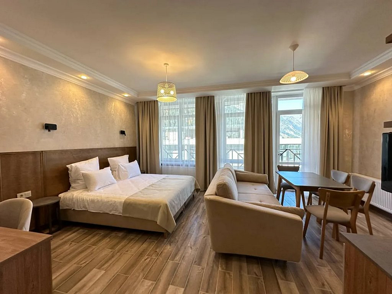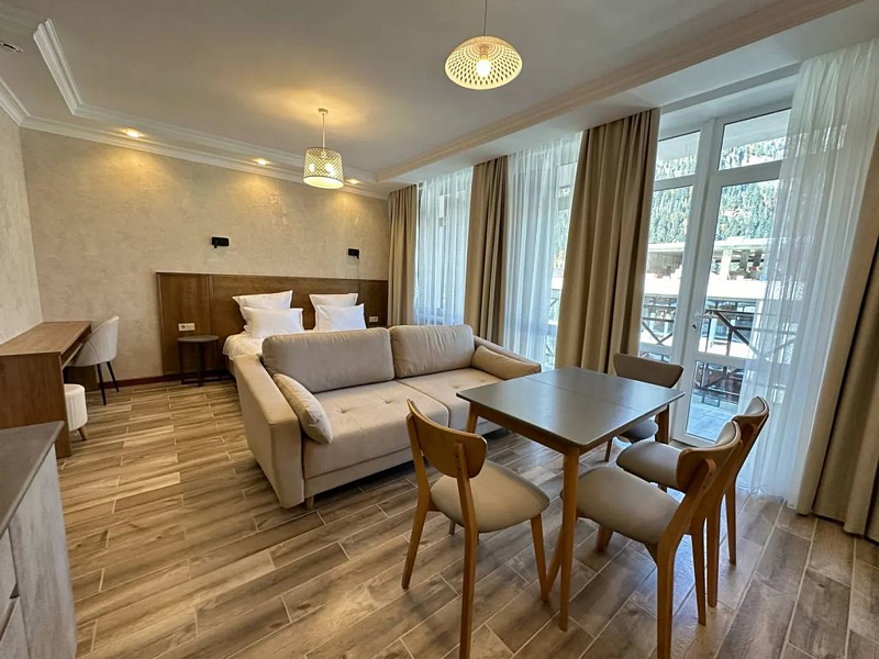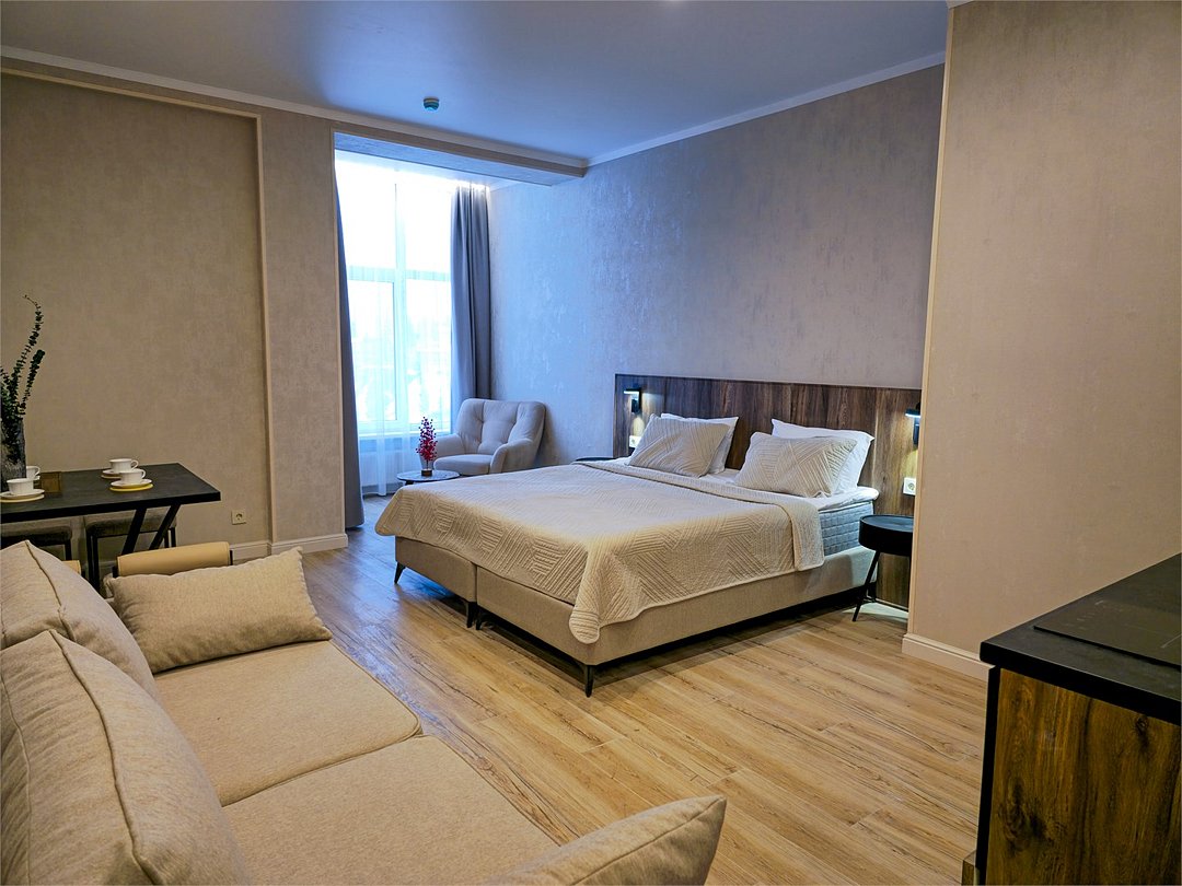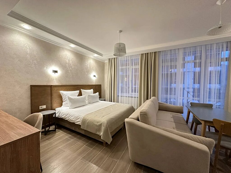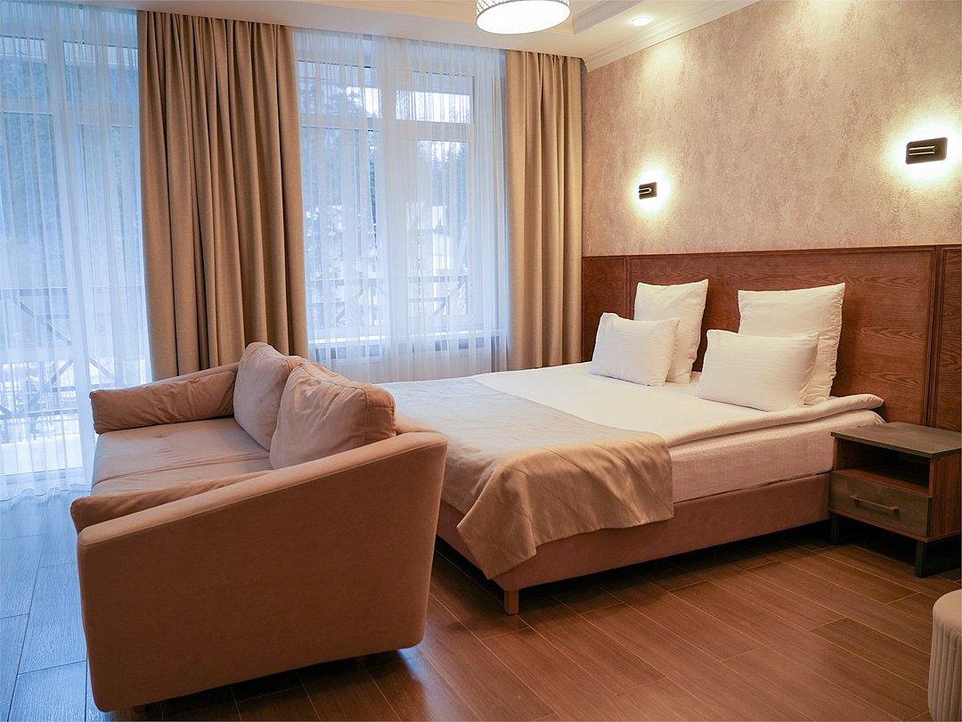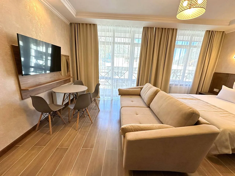 Номера категории «Люкс» с современным дизайном: продуманное объединённое пространство включает спальню, комфортную зону отдыха с диваном и кухонную зону с обеденным столом, где приятно наслаждаться трапезами и общением. Интерьер выполнен в спокойных тонах, создающих атмосферу уюта и тепла. Большие окна обеспечивают естественное освещение и открывают вид на окрестности. Обратите внимание: фотоматериалы являются типовыми. Возможны различия в отделке и комплектации номеров одной категории.Услуги и удобства