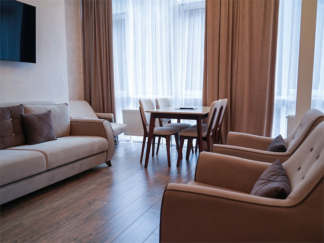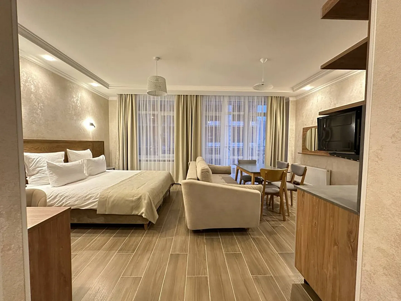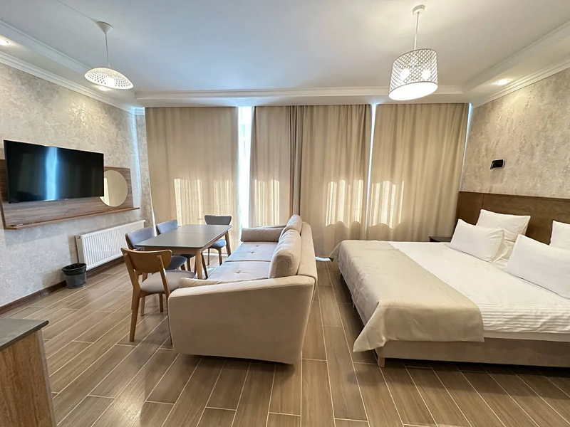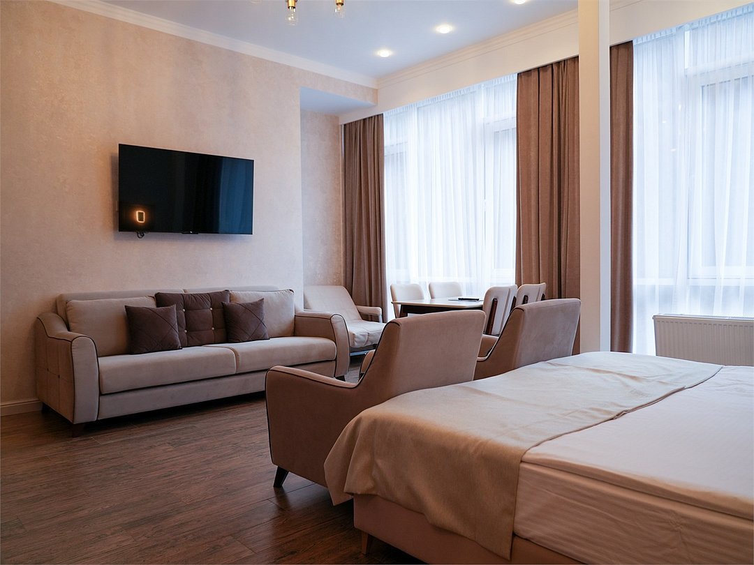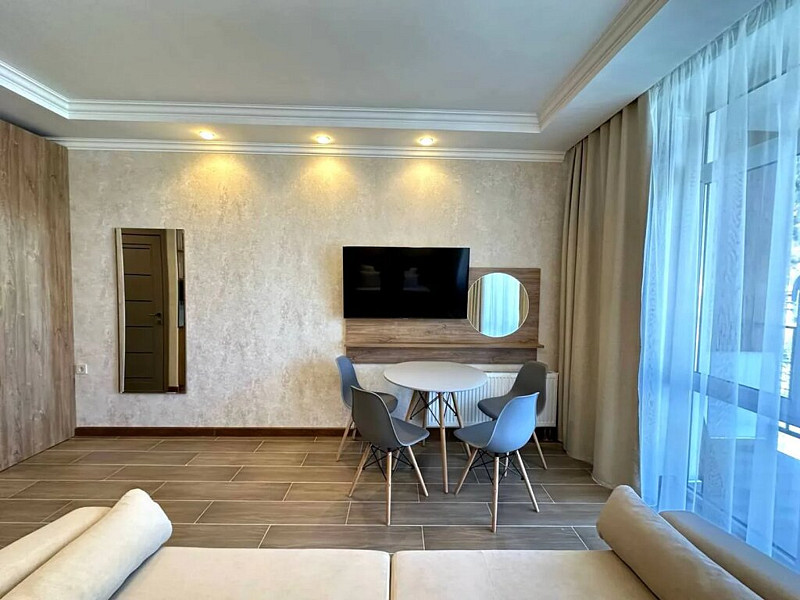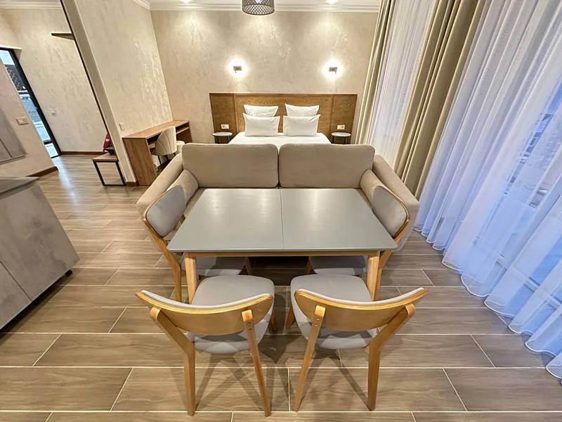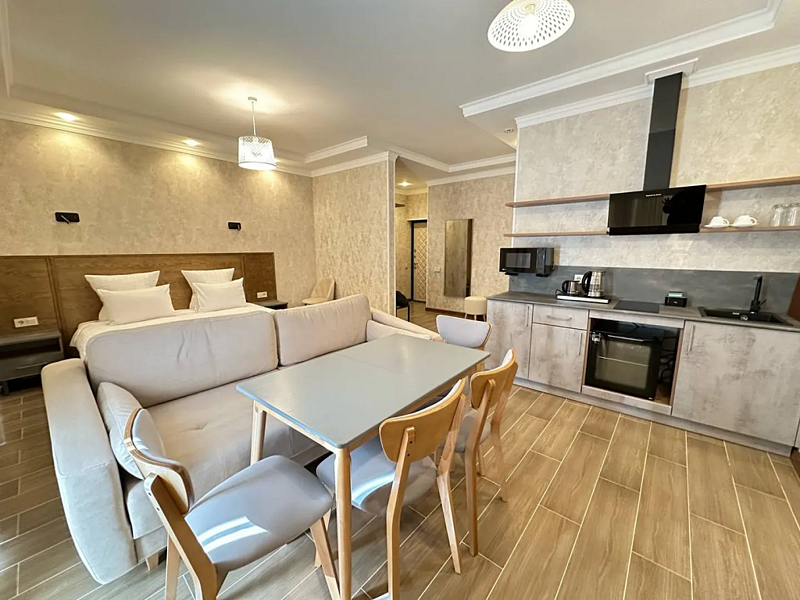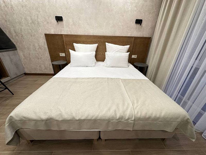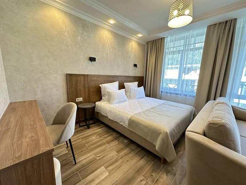 Номера категории «Люкс» с современным дизайном: продуманное объединённое пространство включает спальню, комфортную зону отдыха с диваном и кухонную зону с обеденным столом, где приятно наслаждаться трапезами и общением. Интерьер выполнен в спокойных тонах, создающих атмосферу уюта и тепла. Большие окна обеспечивают естественное освещение и открывают вид на окрестности. Обратите внимание: фотоматериалы являются типовыми. Возможны различия в отделке и комплектации номеров одной категории.Услуги и удобства