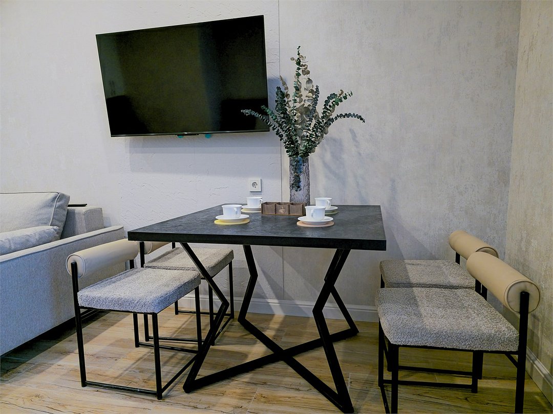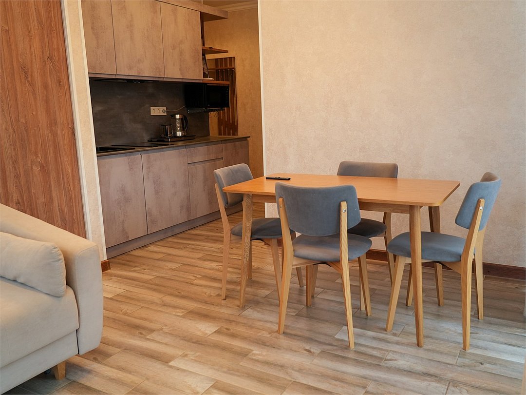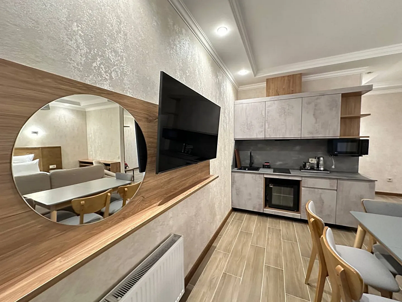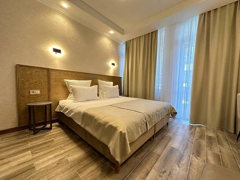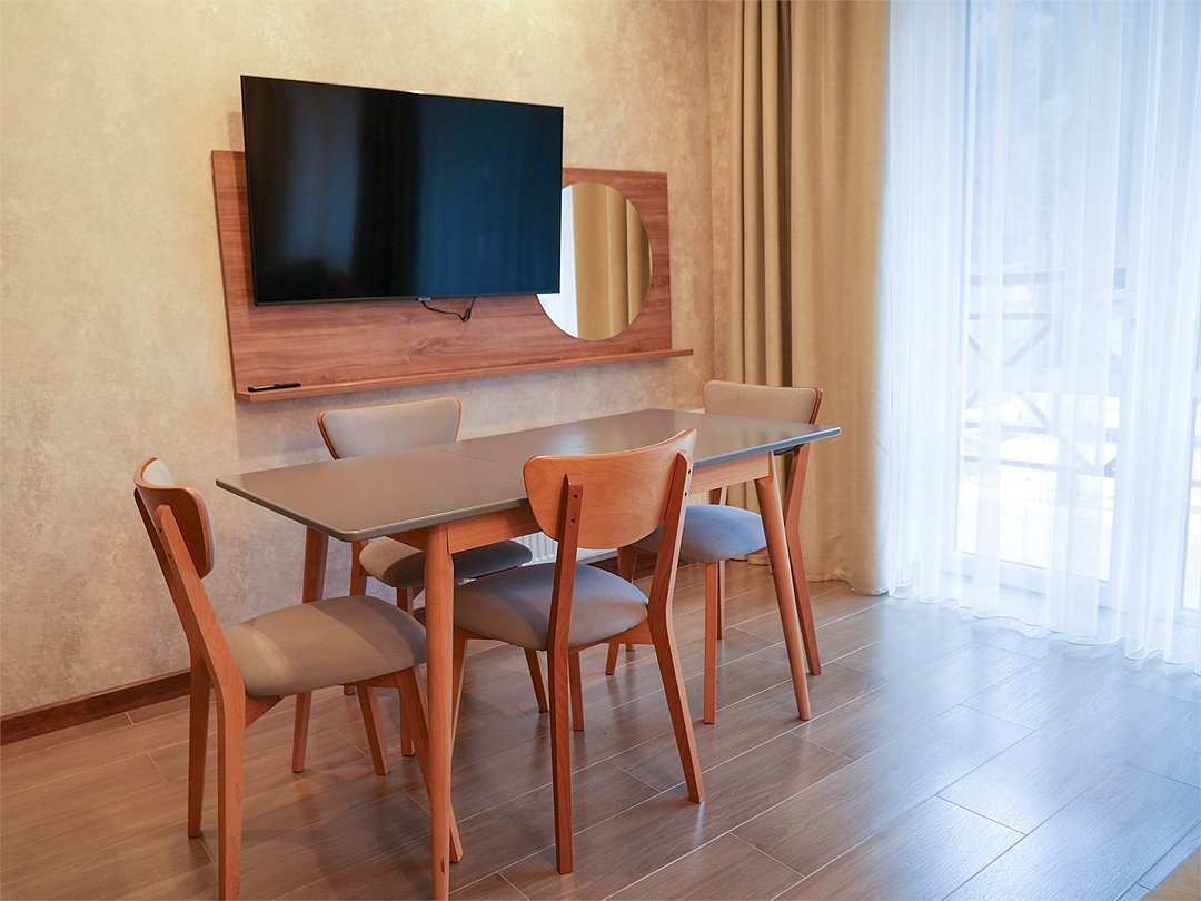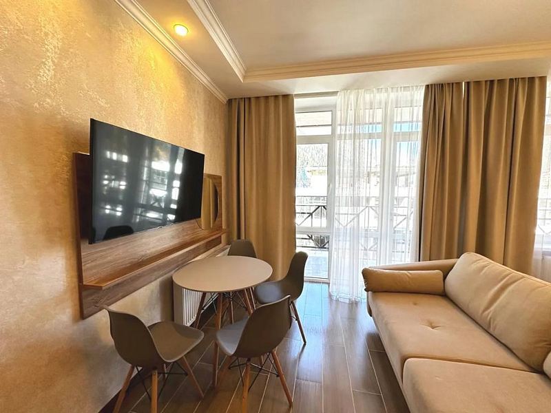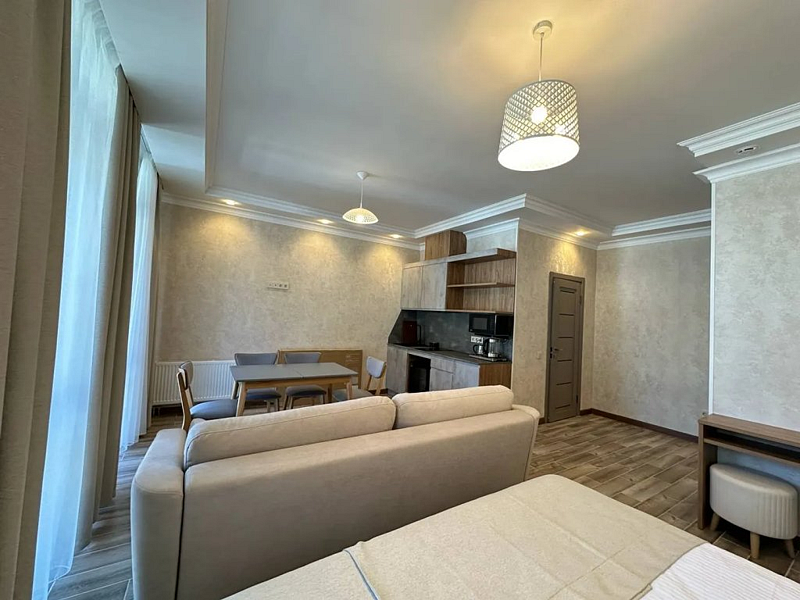 Номера категории «Люкс» с современным дизайном: продуманное объединённое пространство включает спальню, комфортную зону отдыха с диваном и кухонную зону с обеденным столом, где приятно наслаждаться трапезами и общением. Интерьер выполнен в спокойных тонах, создающих атмосферу уюта и тепла. Большие окна обеспечивают естественное освещение и открывают вид на окрестности. Обратите внимание: фотоматериалы являются типовыми. Возможны различия в отделке и комплектации номеров одной категории.Услуги и удобства