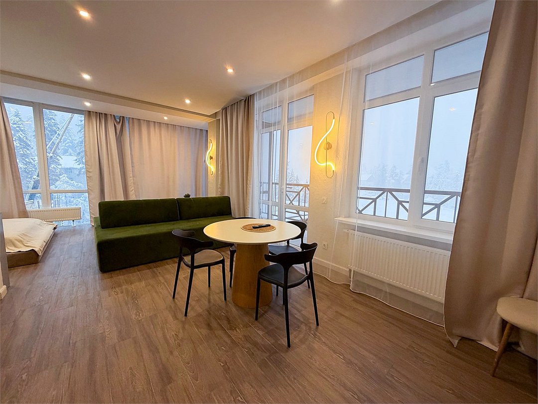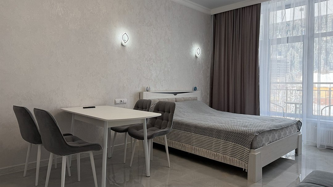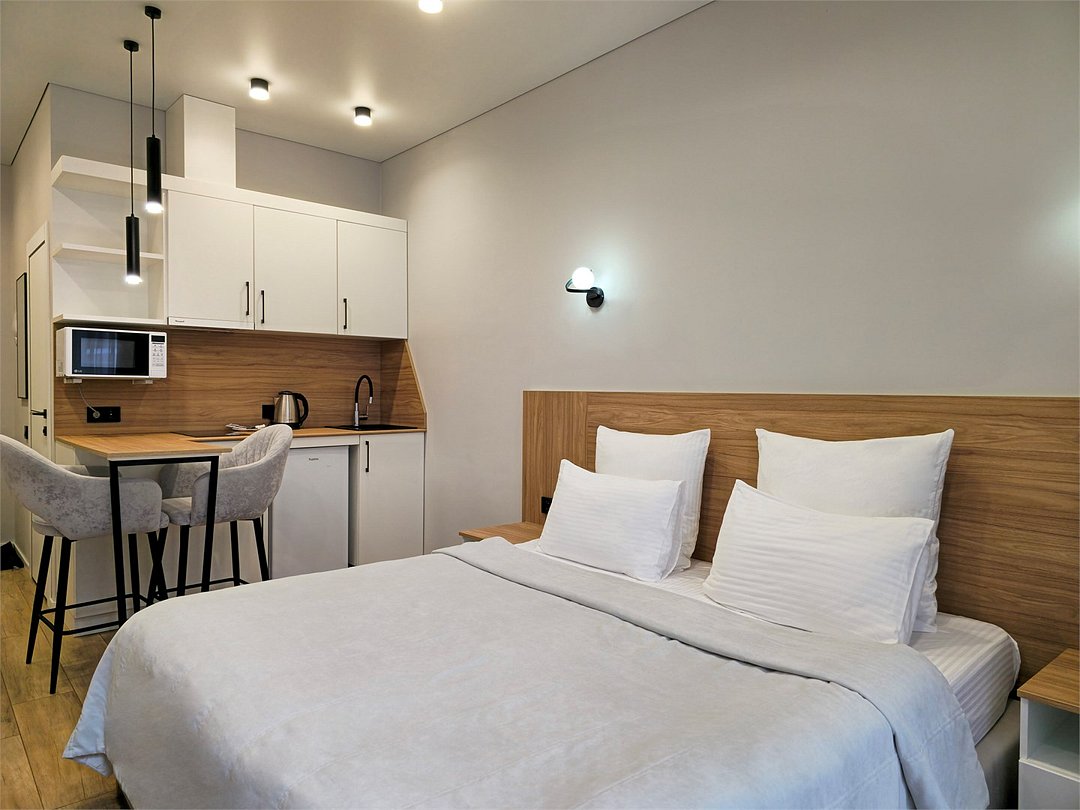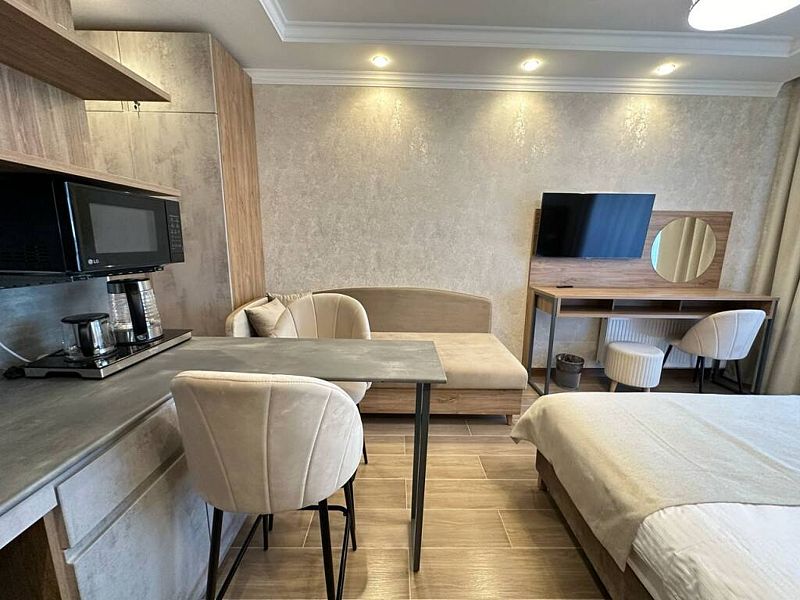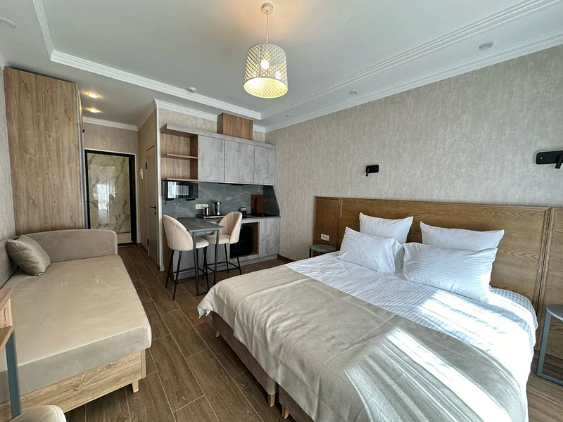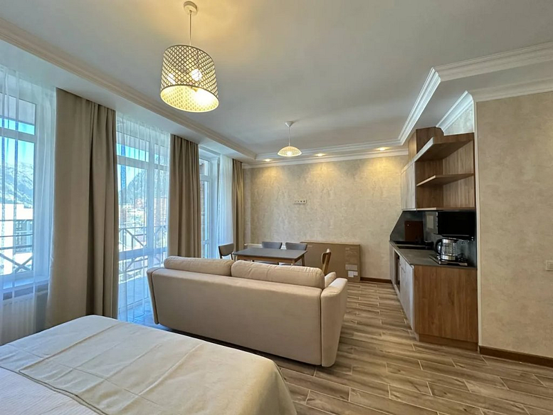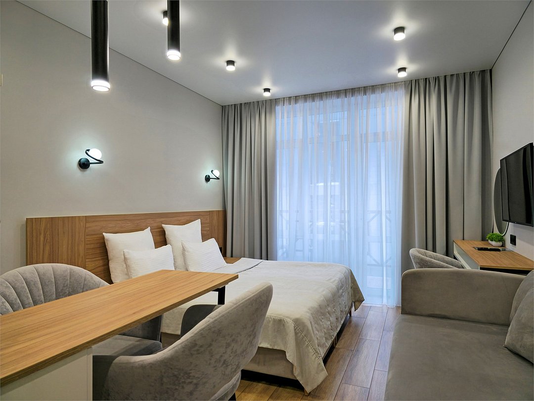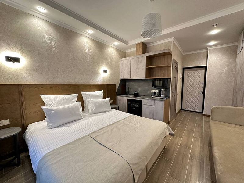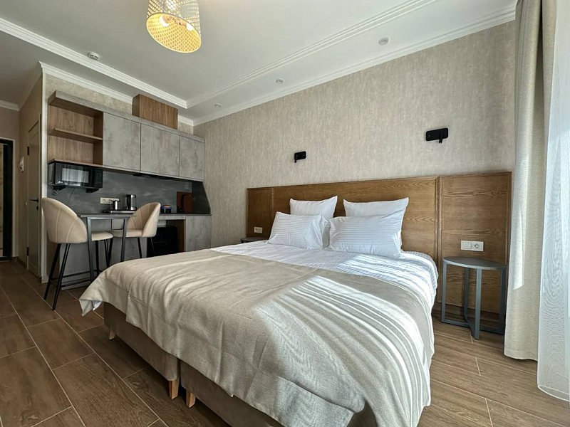 Номера категории «Студия комфорт» — это стильное и функциональное пространство, созданное для комфортного отдыха. В каждом номере предусмотрена просторная комната с удобной кроватью, а также зона отдыха с диваном и креслами. Кухонная зона оборудована всем необходимым для приготовления пищи, а в обеденной зоне можно с комфортом насладиться трапезой. Большие панорамные окна обеспечивают естественное освещение и открывают вид на окрестности. Обратите внимание: фотоматериалы являются типовыми. Возможны различия в отделке и комплектации номеров одной категории.Услуги и удобства