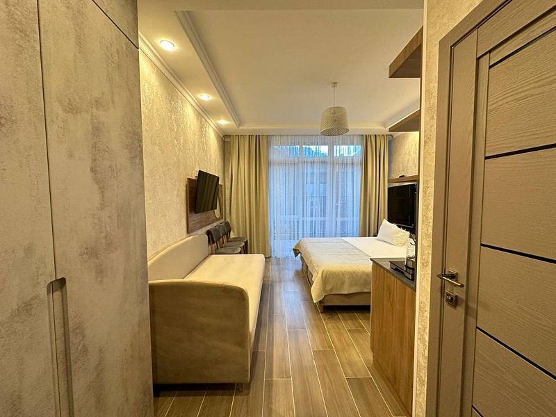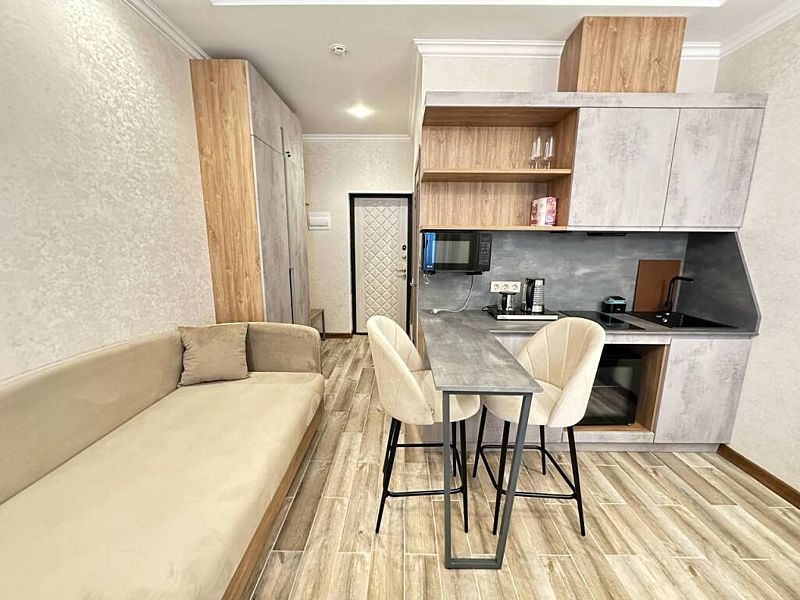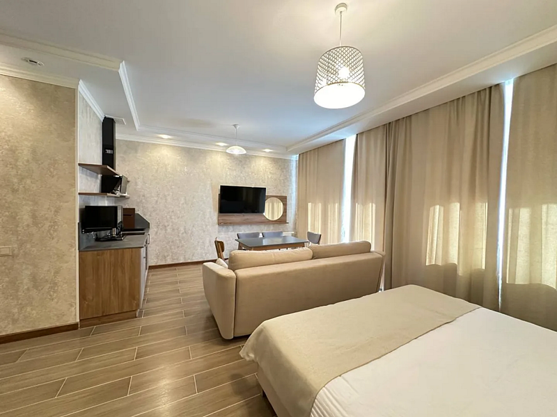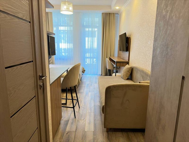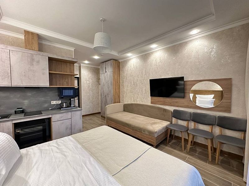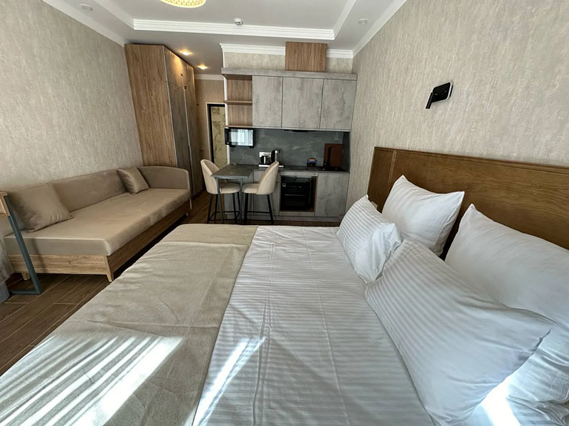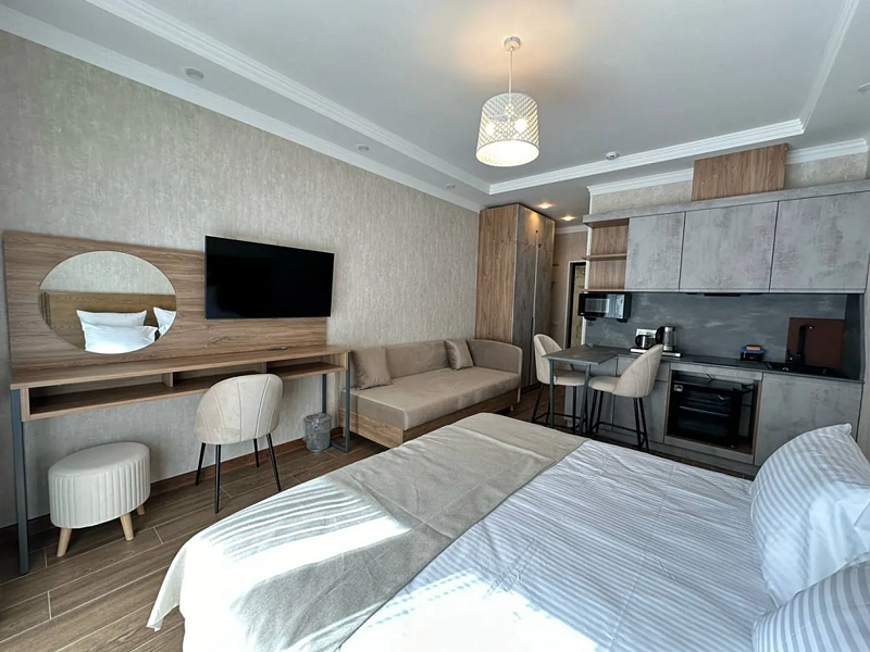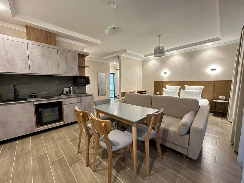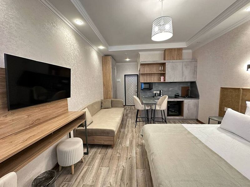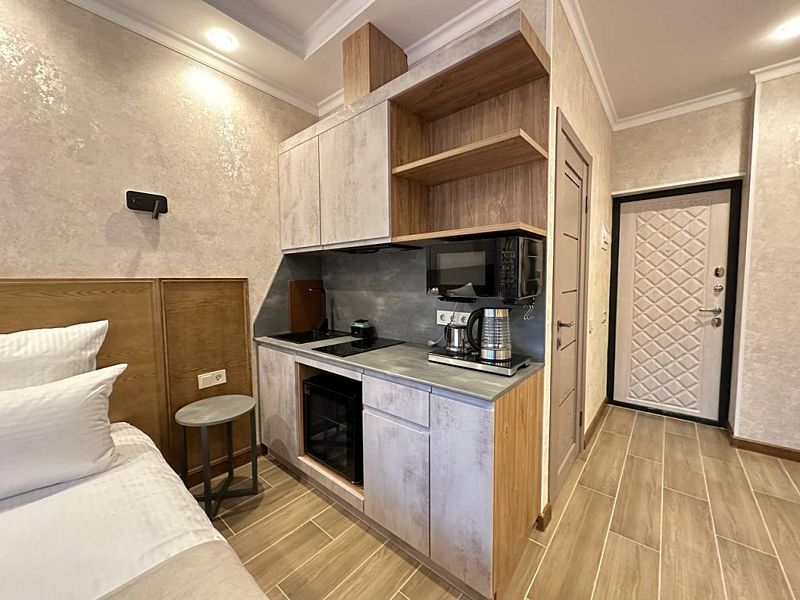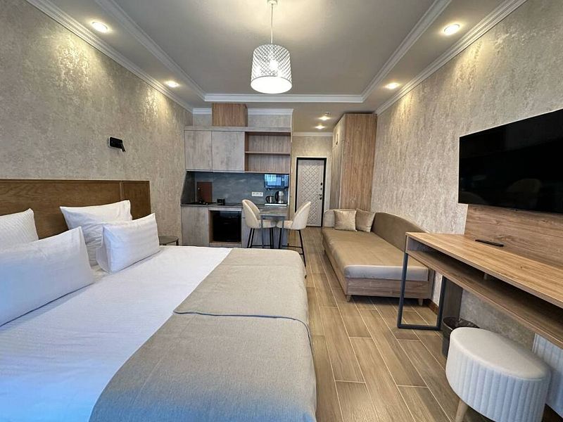 Номера категории «Студия комфорт» — это стильное и функциональное пространство, созданное для комфортного отдыха. В каждом номере предусмотрена просторная комната с удобной кроватью, а также зона отдыха с диваном и креслами. Кухонная зона оборудована всем необходимым для приготовления пищи, а в обеденной зоне можно с комфортом насладиться трапезой. Большие панорамные окна обеспечивают естественное освещение и открывают вид на окрестности. Обратите внимание: фотоматериалы являются типовыми. Возможны различия в отделке и комплектации номеров одной категории.Услуги и удобства