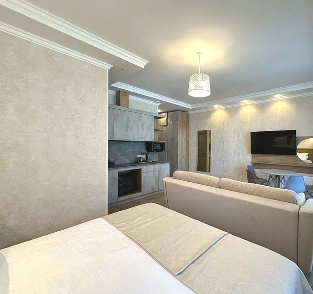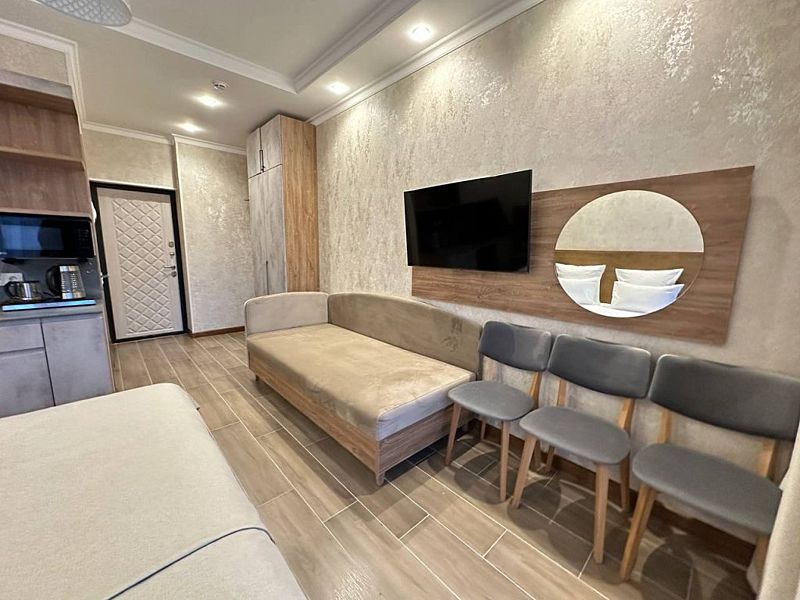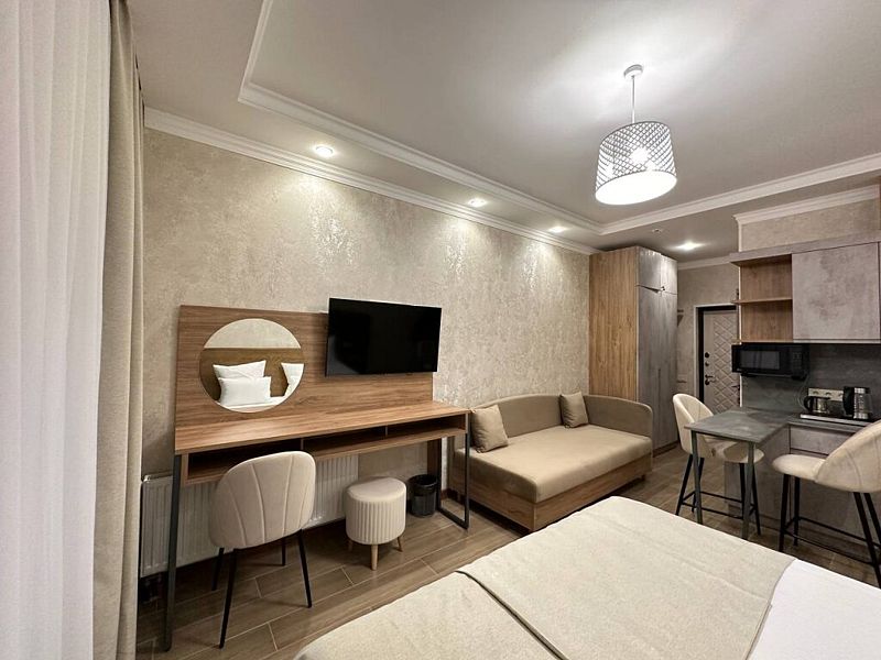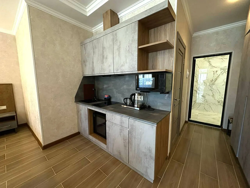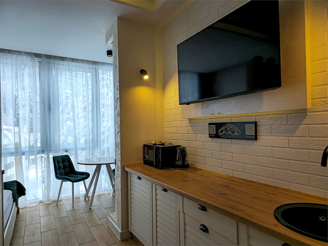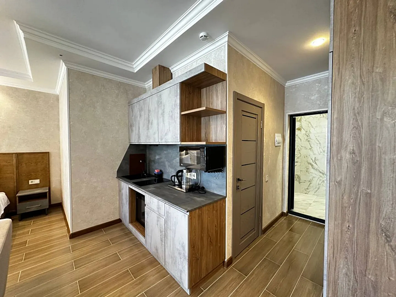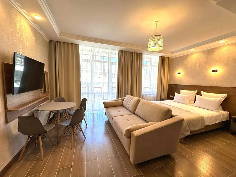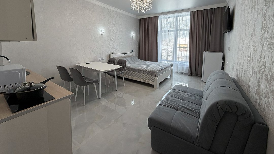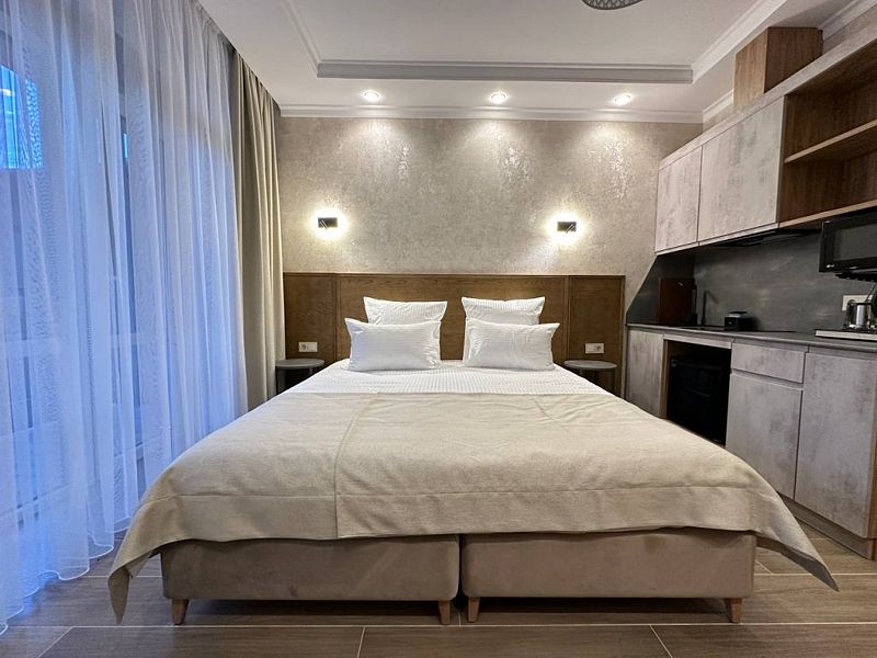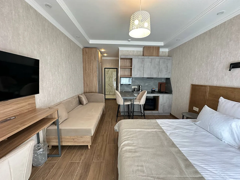 Номера категории «Студия комфорт» — это стильное и функциональное пространство, созданное для комфортного отдыха. В каждом номере предусмотрена просторная комната с удобной кроватью, а также зона отдыха с диваном и креслами. Кухонная зона оборудована всем необходимым для приготовления пищи, а в обеденной зоне можно с комфортом насладиться трапезой. Большие панорамные окна обеспечивают естественное освещение и открывают вид на окрестности. Обратите внимание: фотоматериалы являются типовыми. Возможны различия в отделке и комплектации номеров одной категории.Услуги и удобства
