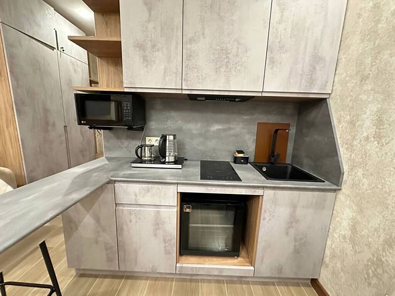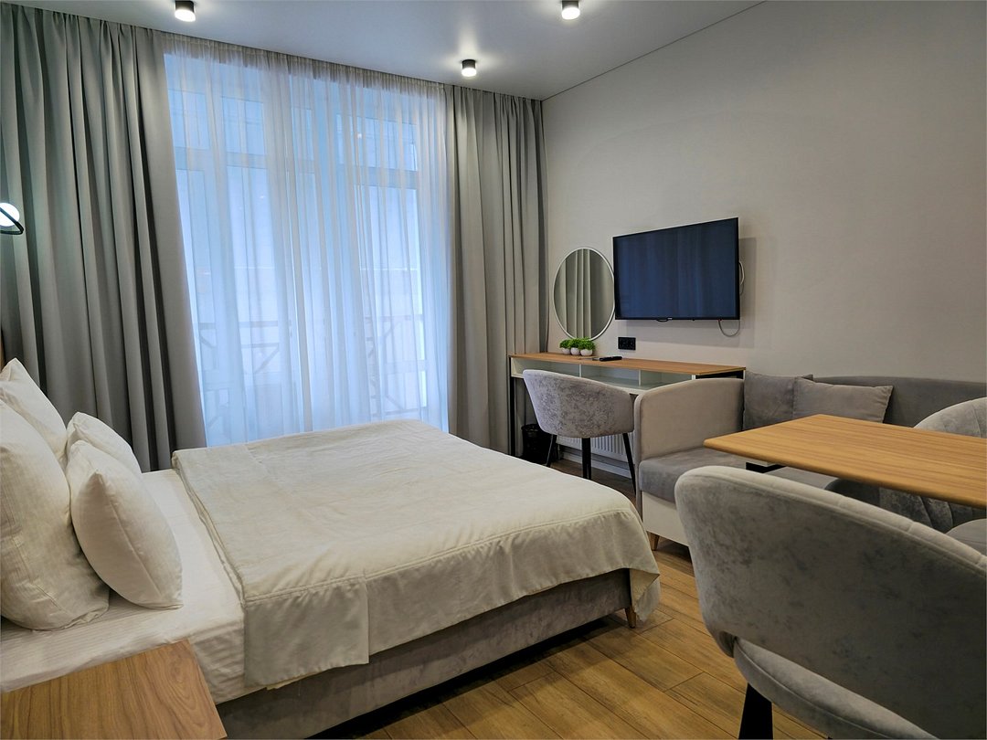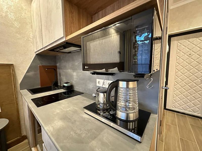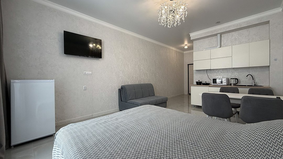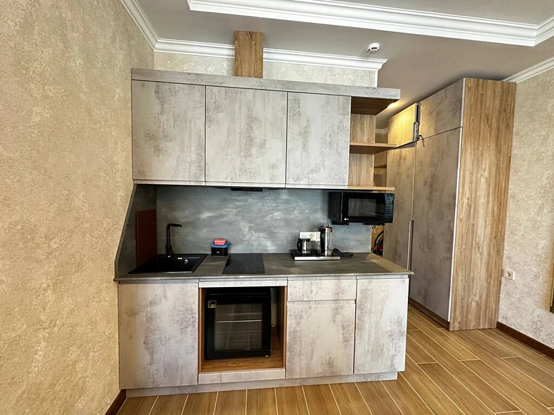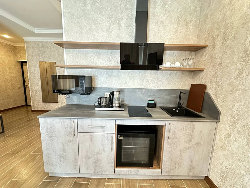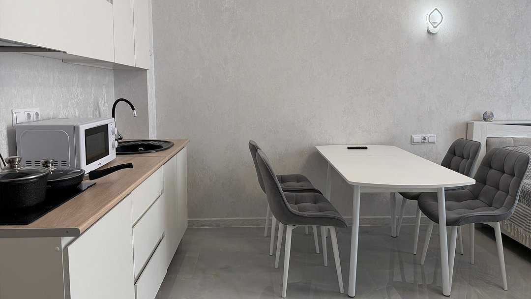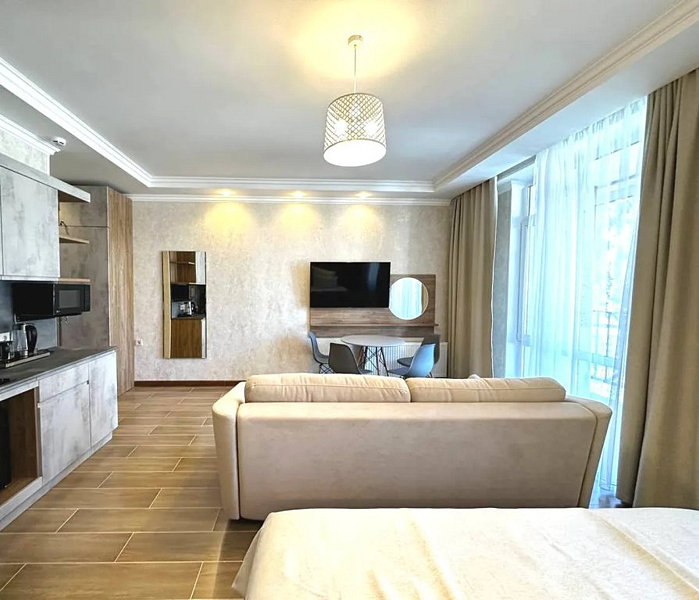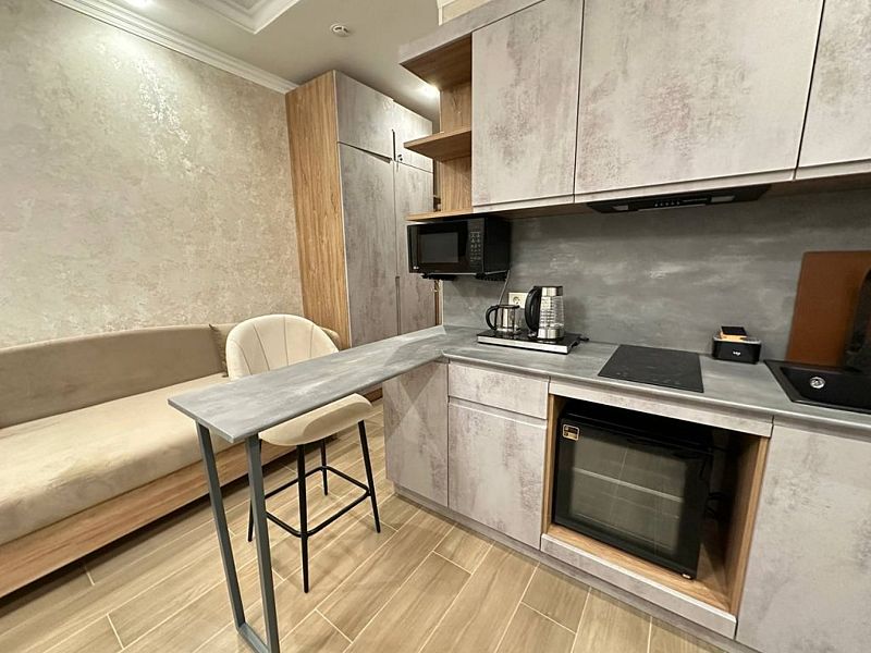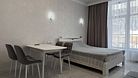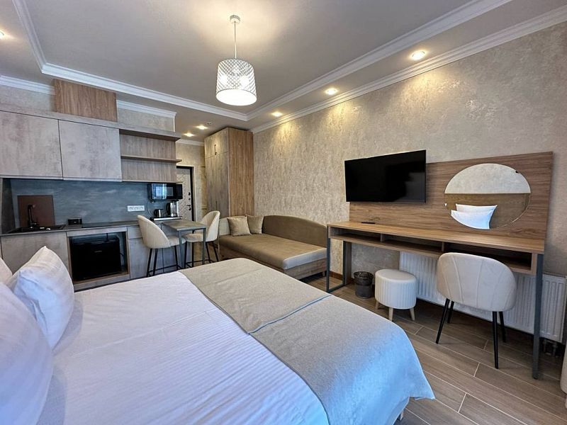 Номера категории «Студия комфорт» — это стильное и функциональное пространство, созданное для комфортного отдыха. В каждом номере предусмотрена просторная комната с удобной кроватью, а также зона отдыха с диваном и креслами. Кухонная зона оборудована всем необходимым для приготовления пищи, а в обеденной зоне можно с комфортом насладиться трапезой. Большие панорамные окна обеспечивают естественное освещение и открывают вид на окрестности. Обратите внимание: фотоматериалы являются типовыми. Возможны различия в отделке и комплектации номеров одной категории.Услуги и удобства
