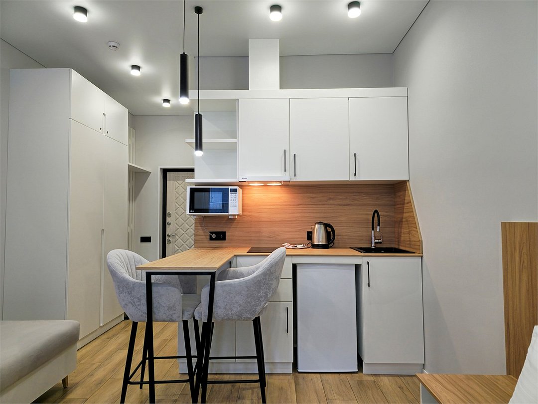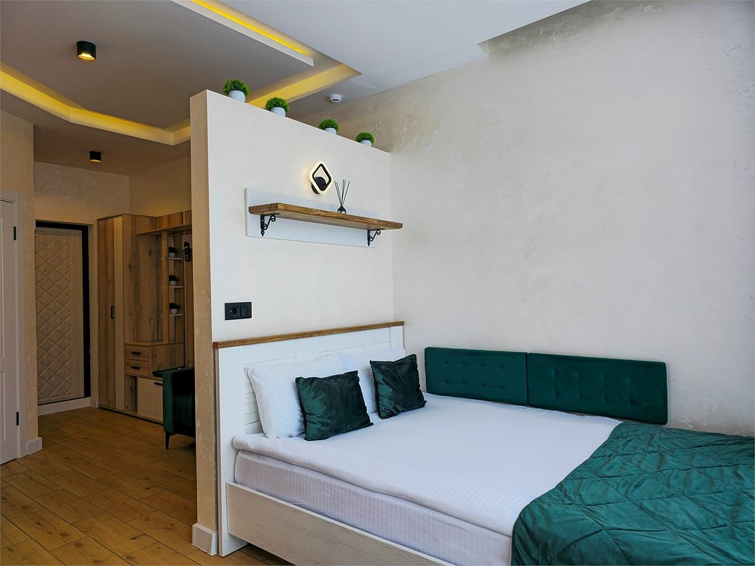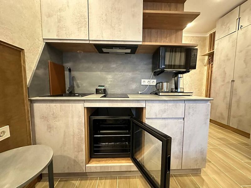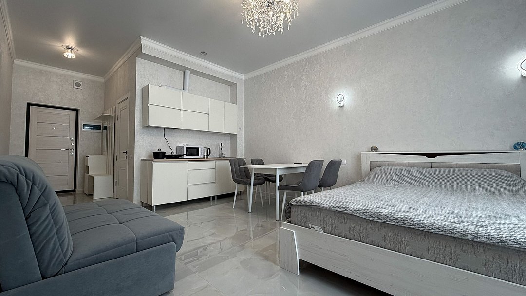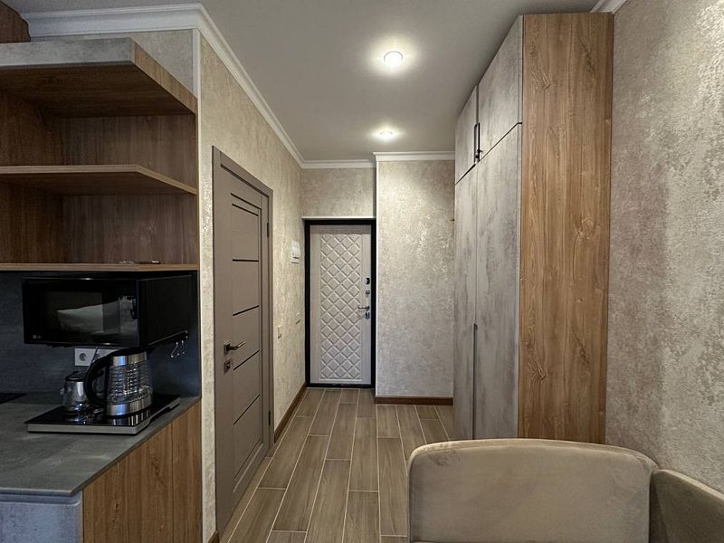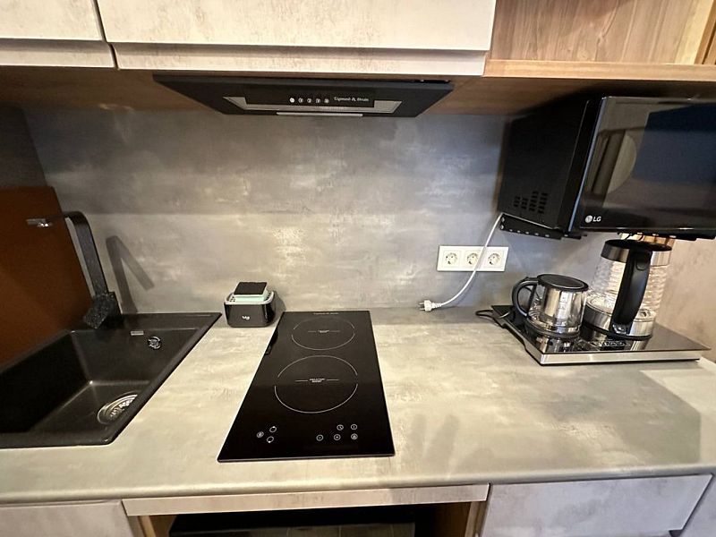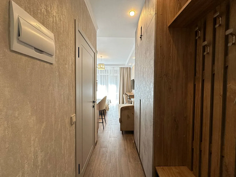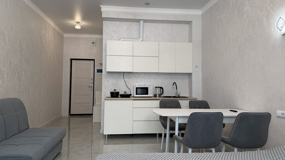 Номера категории «Студия комфорт» — это стильное и функциональное пространство, созданное для комфортного отдыха. В каждом номере предусмотрена просторная комната с удобной кроватью, а также зона отдыха с диваном и креслами. Кухонная зона оборудована всем необходимым для приготовления пищи, а в обеденной зоне можно с комфортом насладиться трапезой. Большие панорамные окна обеспечивают естественное освещение и открывают вид на окрестности. Обратите внимание: фотоматериалы являются типовыми. Возможны различия в отделке и комплектации номеров одной категории.Услуги и удобства