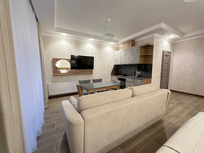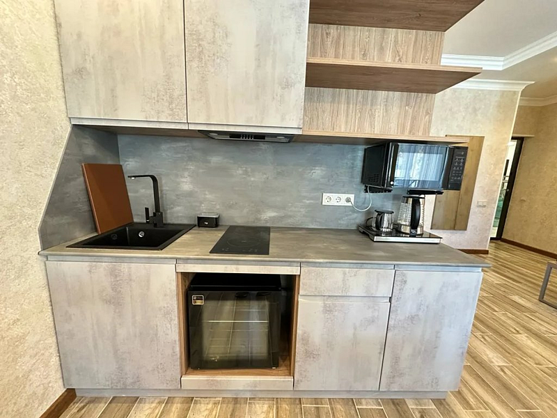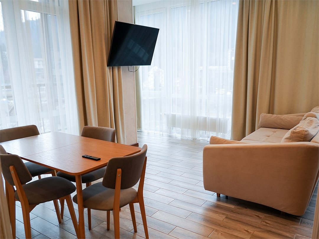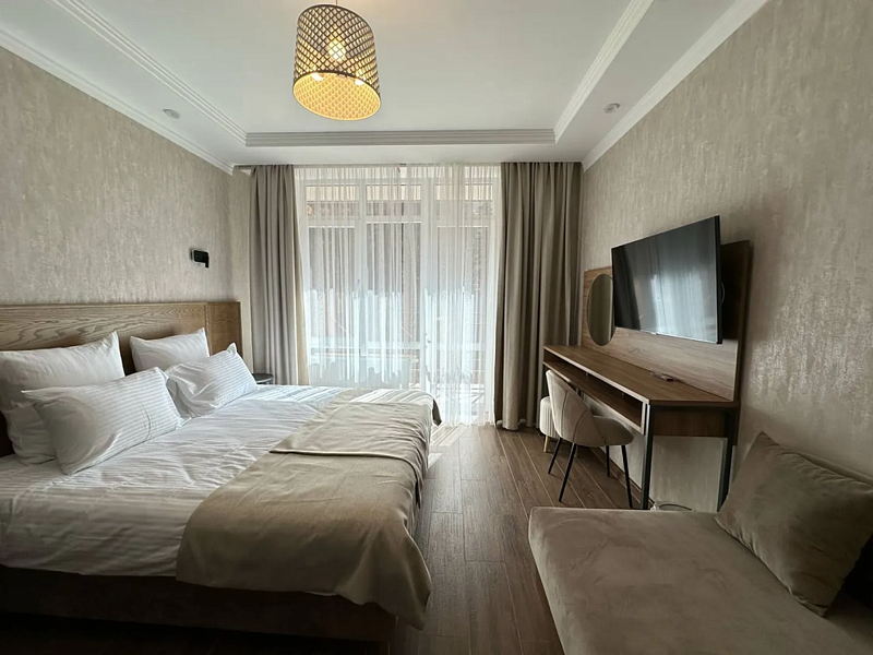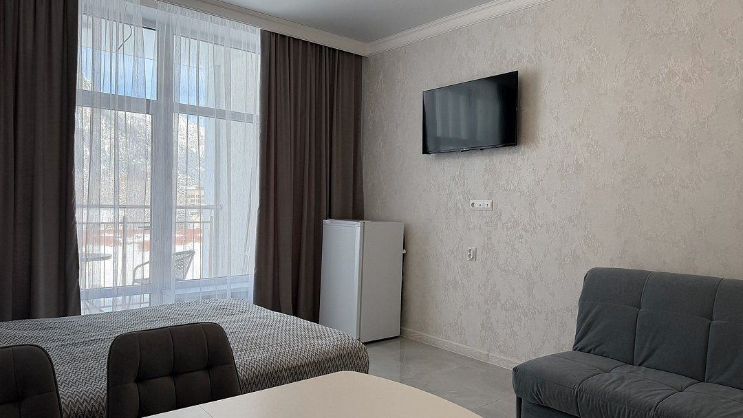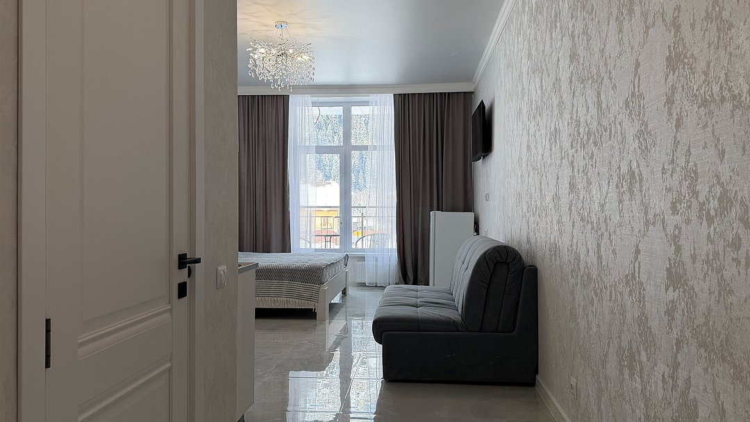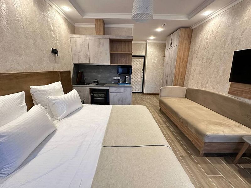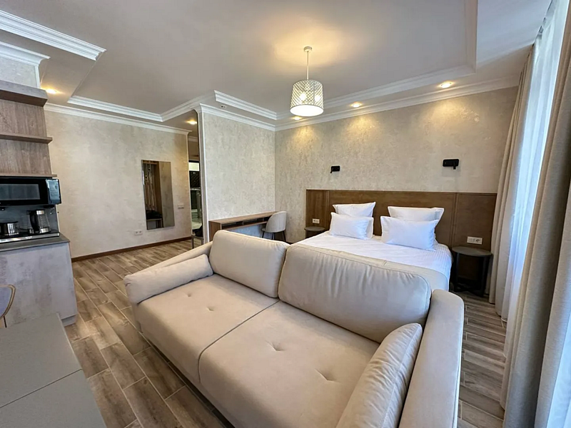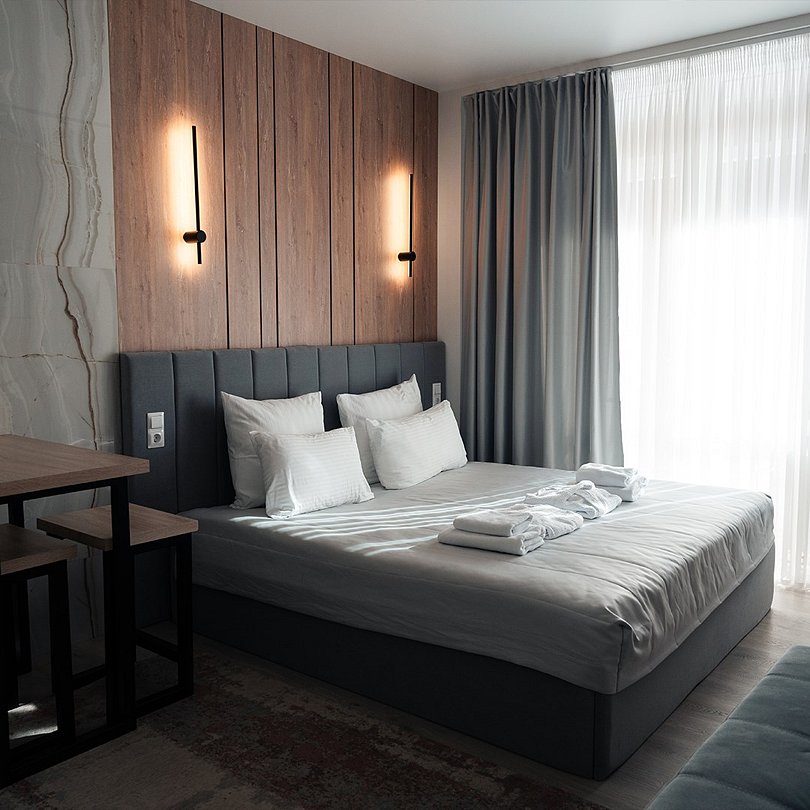 Номера категории "Стандарт комфорт+" — это стильное и уютное пространство в нейтральных тонах. Просторная кровать и удобный диван обеспечивают комфортный отдых, а функциональная кухня позволяет с удобством готовить. С балкона номера открывается живописный вид на горы. Номера категории "Стандарт комфорт" расположены на 4,5,7 этажах. Обратите внимание: фотоматериалы являются типовыми. Возможны различия в отделке и комплектации номеров одной категории.Услуги и удобства