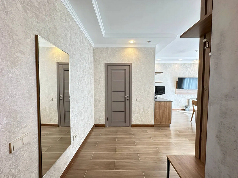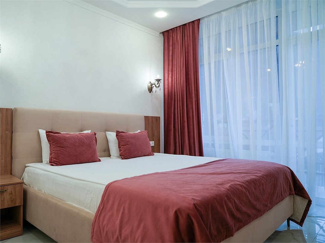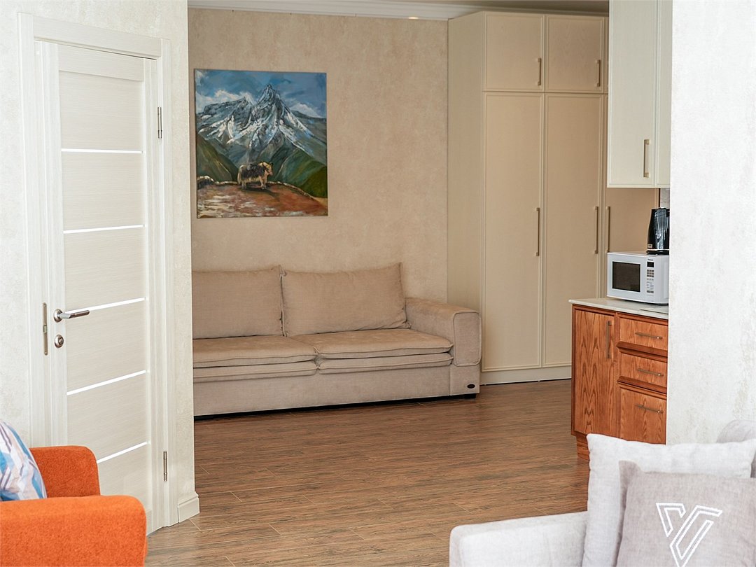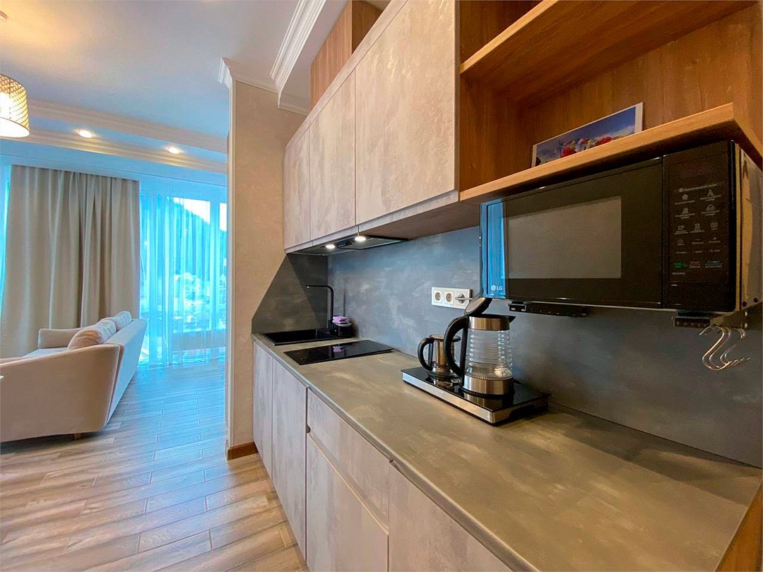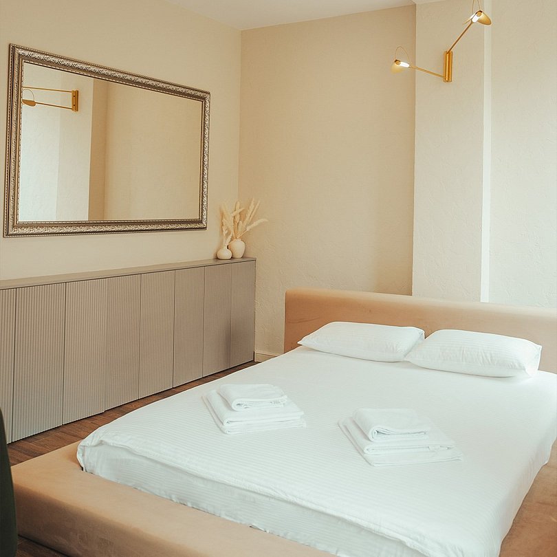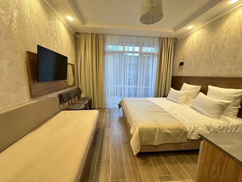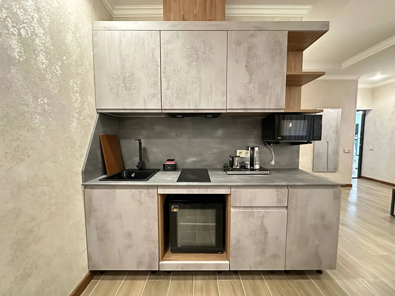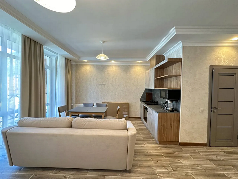 Номера категории "Стандарт комфорт+" — это стильное и уютное пространство в нейтральных тонах. Просторная кровать и удобный диван обеспечивают комфортный отдых, а функциональная кухня позволяет с удобством готовить. С балкона номера открывается живописный вид на горы. Номера категории "Стандарт комфорт" расположены на 4,5,7 этажах. Обратите внимание: фотоматериалы являются типовыми. Возможны различия в отделке и комплектации номеров одной категории.Услуги и удобства