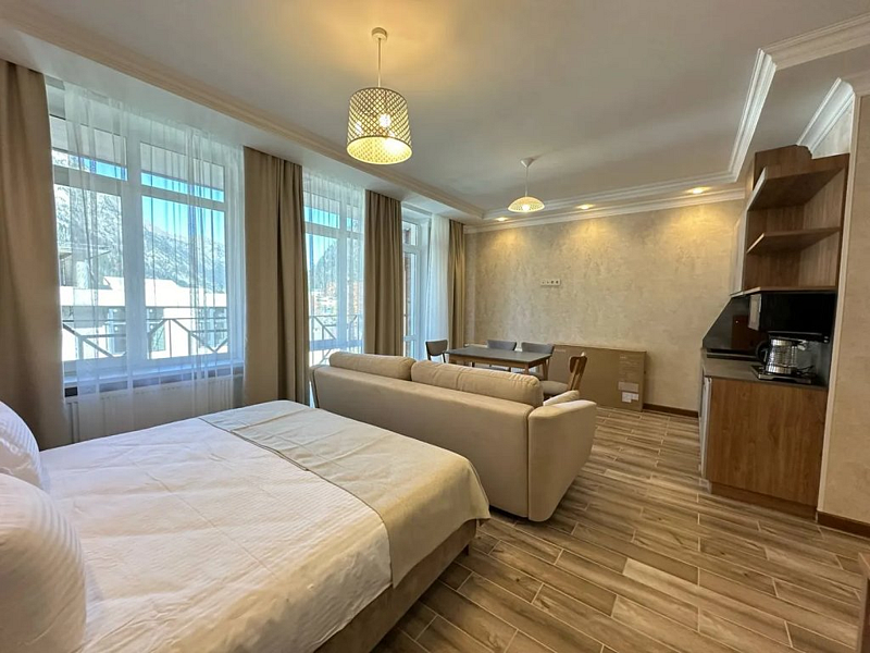Номера категории "Студия" предлагают интегрированное пространство гостиной со столом, кухней и зоной для отдыха. В номерах установлена большая кровать и раскладной диван, что позволяет комфортно разместиться гостям. Вдохновляющие виды из панорамных окон на окружающую природу подарят вам спокойствие и уединение, а кухня оснащенная необходимой бытовой техникой, позволит чувствовать себя как дома. Обратите внимание: фотоматериалы являются типовыми. Возможны различия в отделке и комплектации номеров одной категории.Услуги и удобства