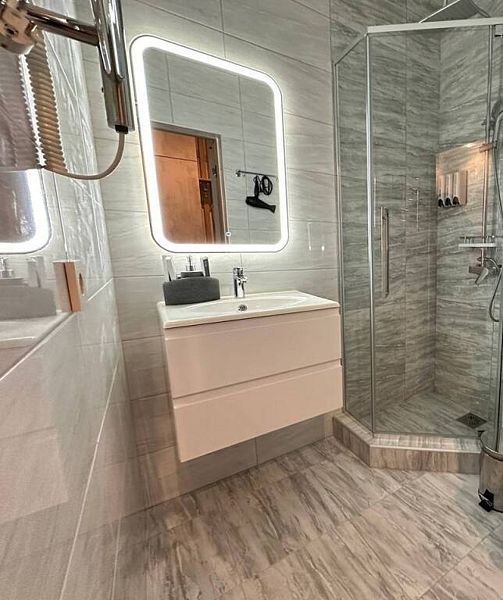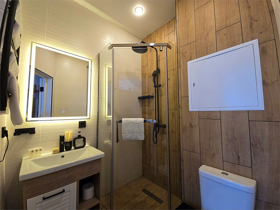 телевизор, светильник, фен, плита для приготовления пищи, микроволновая печь, ванная комната, душевая кабина, санузел, теплый пол, халаты, тапочки, гигиенические средства, косметические средства, балкон, двуспальная кровать, диван, стулья, шкаф для одежды, обеденный стол, зеркало, чайный набор, чайник, обеденная зона, отопление, душ, плиточное покрытие, кресло, высокие потолки, стаканы, кухонная утварь, столовые приборы, сушилка для белья, диван-кровать, мини-холодильник, мини-кухня, вид на горы, телевизор со Smart TV, теплые полы, номер для некурящих, уборка номера, набор для приготовления чая и кофе, услуги прачечной (платно), дождевой и ручной душ, можно с питомцами, Android TVВ гостиничном номере