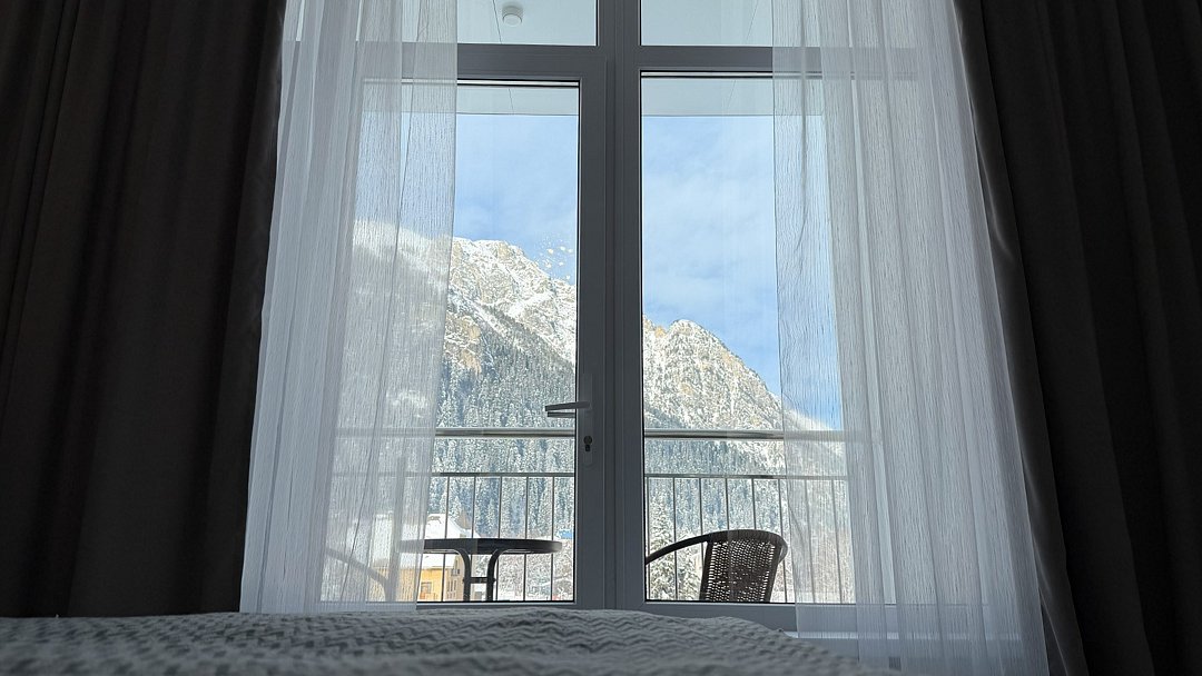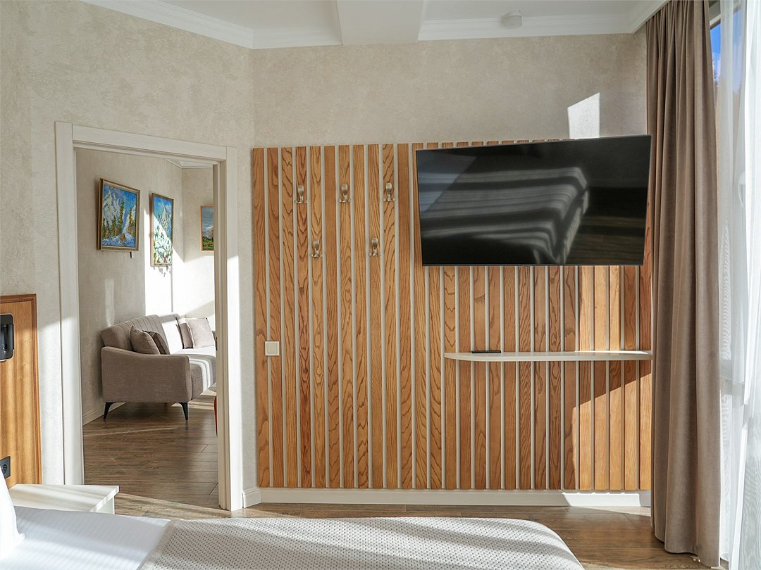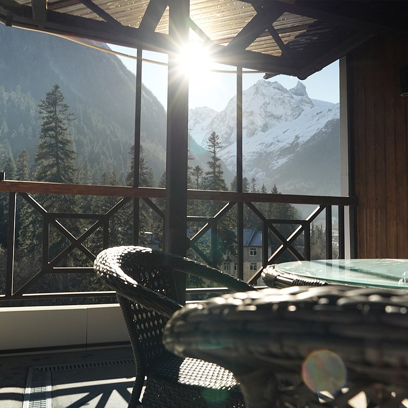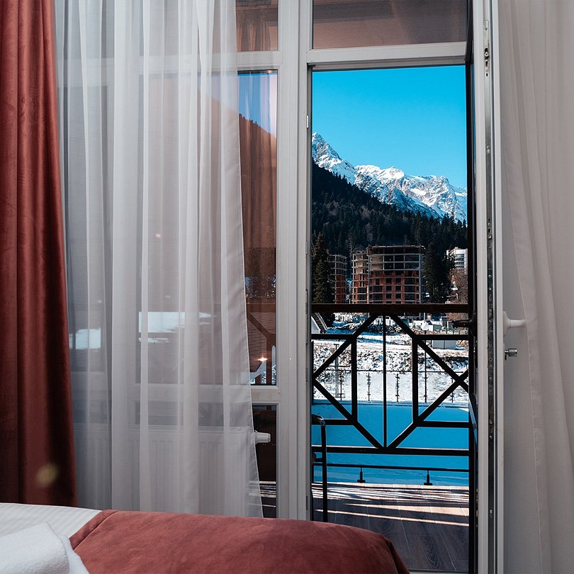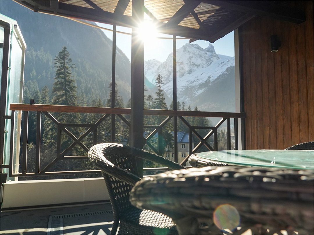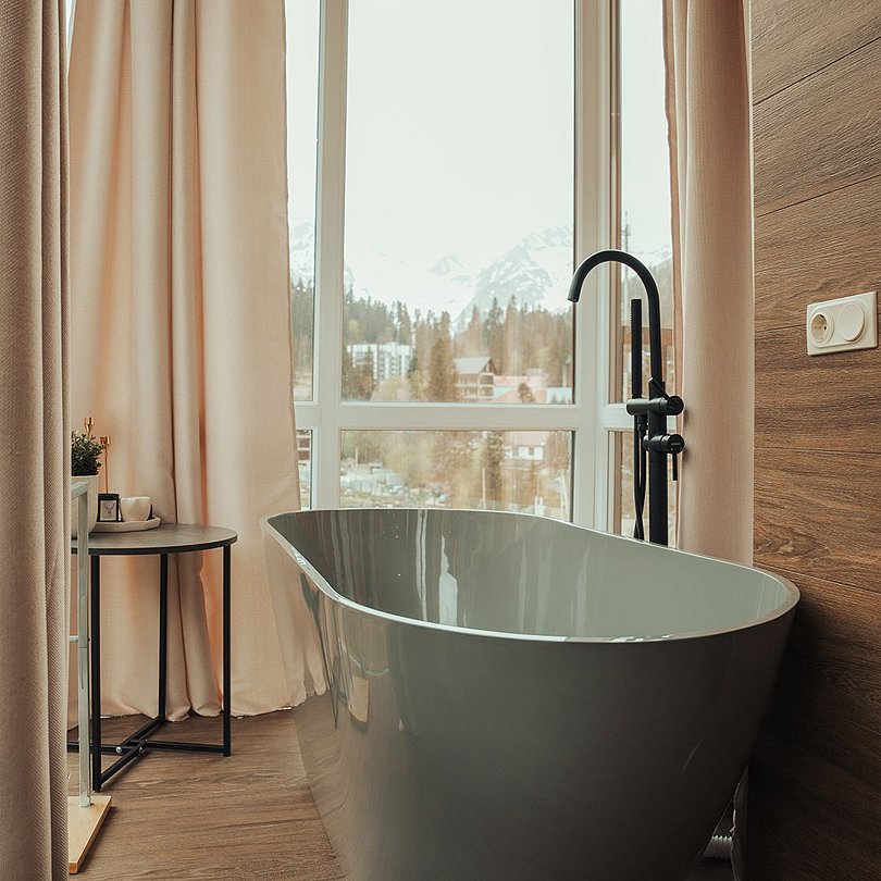 Стильные просторные номера, созданные для отдыха «с картинкой». Главная фишка категории — отдельностоящая ванна у панорамного окна с видом на горы Домбая: можно принимать ванну и любоваться вершинами и огнями курорта. В каждом номере — двуспальная кровать, уютная зона отдыха с диваном и дизайнерским светом, большой ТВ. Есть мини-кухня (варочная поверхность, мойка, микроволновка) и обеденный стол. Дополняет впечатление балкон с прекрасным видом. Обратите внимание: фотоматериалы являются типовыми. Возможны различия в отделке и комплектации номеров одной категории.Услуги и удобства