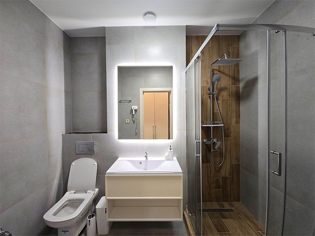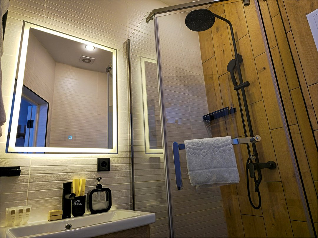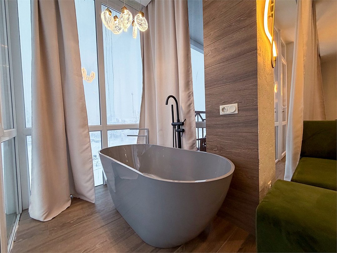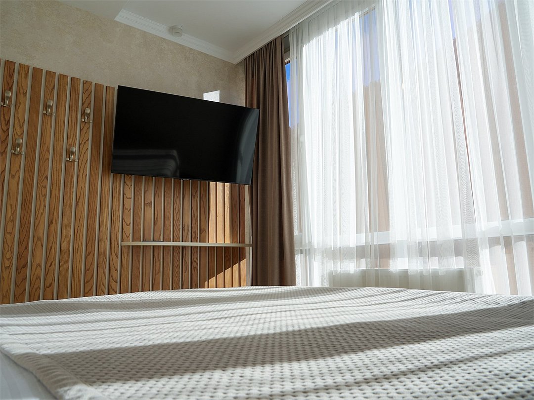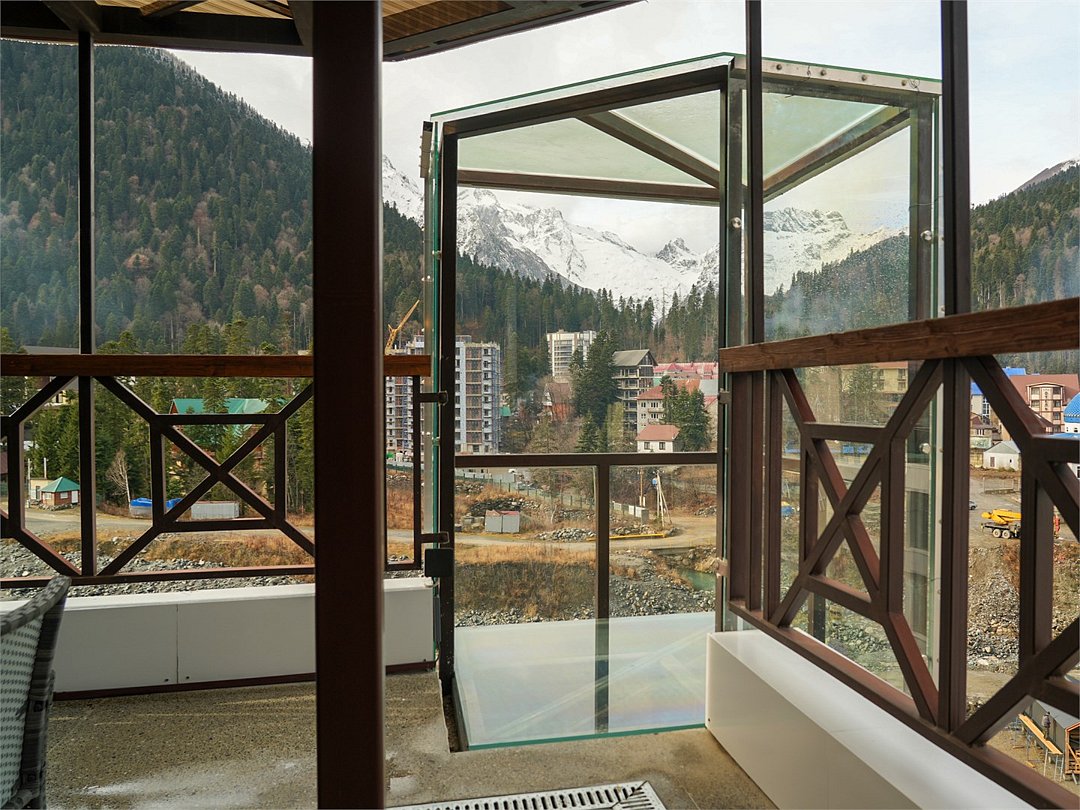Стильные просторные номера, созданные для отдыха «с картинкой». Главная фишка категории — отдельностоящая ванна у панорамного окна с видом на горы Домбая: можно принимать ванну и любоваться вершинами и огнями курорта. В каждом номере — двуспальная кровать, уютная зона отдыха с диваном и дизайнерским светом, большой ТВ. Есть мини-кухня (варочная поверхность, мойка, микроволновка) и обеденный стол. Дополняет впечатление балкон с прекрасным видом. Обратите внимание: фотоматериалы являются типовыми. Возможны различия в отделке и комплектации номеров одной категории.Услуги и удобства