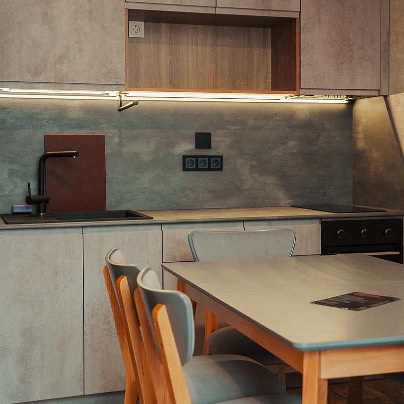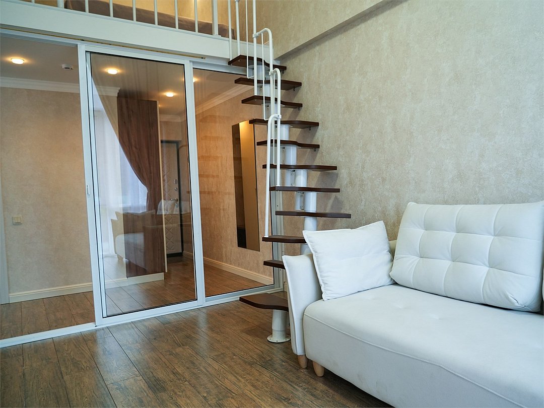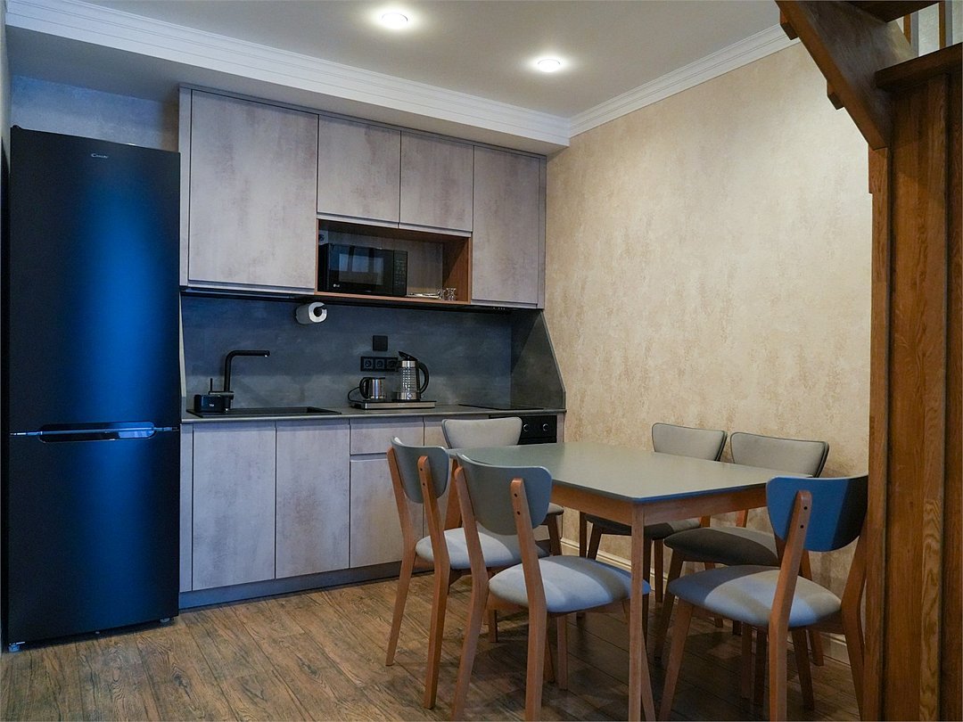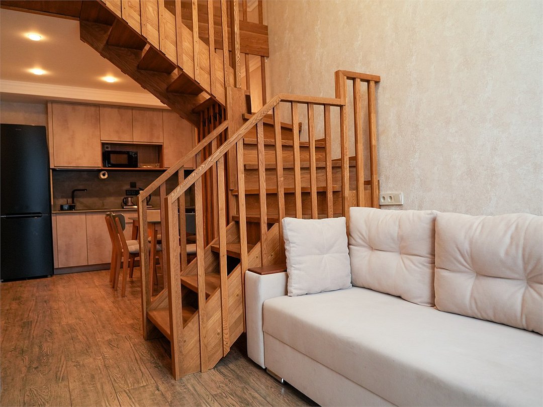 Уютные двухэтажные номера с натуральными элементами отделки и современным дизайном сочетают комфорт и функциональность. На первом уровне расположены спальня, просторная кухонная зона и обеденная зона, располагающие к приятным трапезам и общению. Деревянная лестница ведёт на второй этаж, где находится спальная зона с мягким освещением и удобной кроватью. Тёплые оттенки в оформлении создают атмосферу покоя и домашнего уюта. Обратите внимание: фотоматериалы являются типовыми. Возможны различия в отделке и комплектации номеров одной категории.Услуги и удобства
