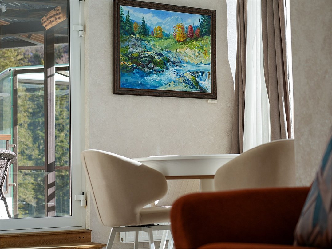Номер «Арт пентхаус» – это светлый, просторный номер с террасой, которая оснащена удобной мебелью и диванами, располагающими к отдыху на свежем воздухе. Гостиная с большими панорамными окнами, плавно переходящая в просторную кухню и обеденную зону, где можно насладиться приятными трапезами. Спальня с панорамными окнами, открывающими живописные виды. Номер носит название «Арт» не случайно: интерьер украшают картины местных художников, создавая неповторимую атмосферу, которая позволит насладиться великолепными видами, искусством и уединением. Обратите внимание: фотоматериалы являются типовыми. Возможны различия в отделке и комплектации номеров одной категории.Услуги и удобства