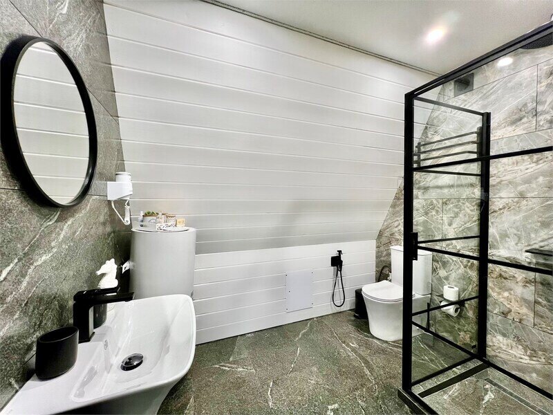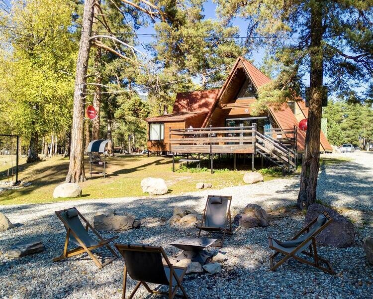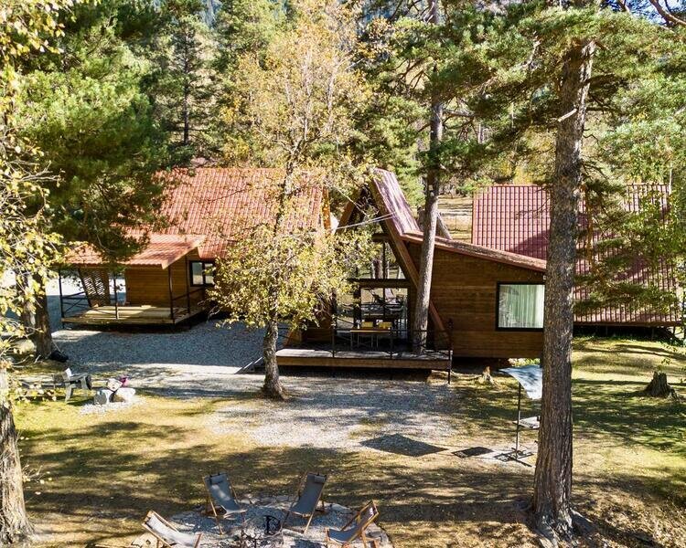 На территории площадью в 3 гектара размещены уютные домики А-фрейм и двухэтажный домик с собственной баней, которые могут принять от 4 до 7 гостей и имеют площадь от 52 до 112 квадратных метров. Внутри каждого домика есть кухня с необходимой посудой, уютная терраса с зоной отдыха и мангалом.