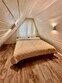 В эко-доме 2 спальни: 1 двуспальная кровать и 1 односпальная кровать в одной комнате и 2 односпальные кровати и диван в другой.