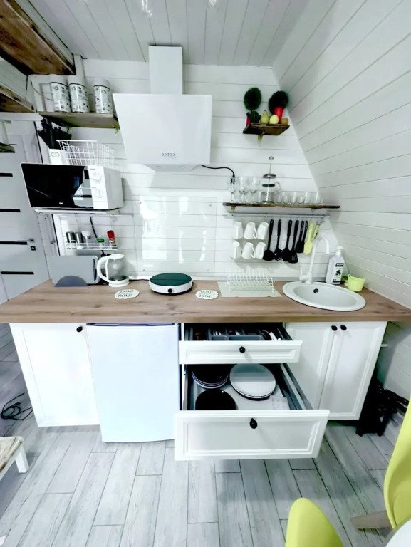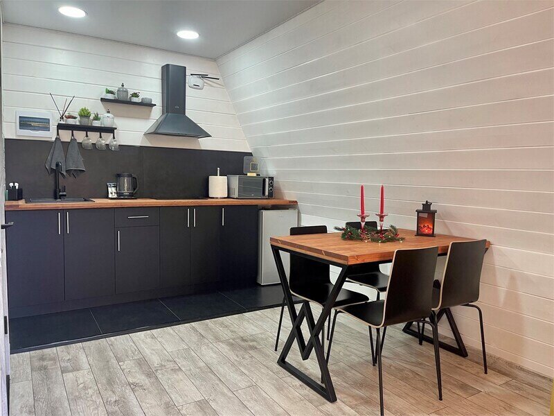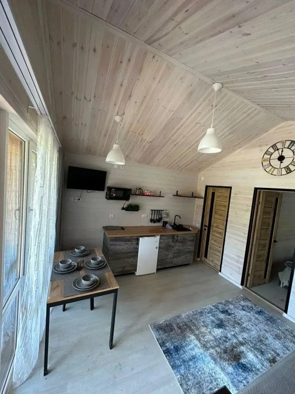 В эко-доме 2 двуспальные кровати и диван, телевизор со спутниковым ТВ, имеется собственная кухня, оснащенная микроволновой печью, электрической плитой, мини-холодильником с морозильной камерой, эл. чайником.