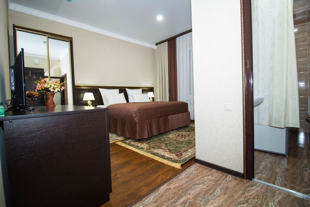 В номере имеется спальная зона с удобной двуспальной кроватью, рабочая зона с функциональным рабочим столом, гостиный уголок с диваном и столиком, и просторная ванная комната с бодрящим душем – все для восстановления сил после насыщенного дня.