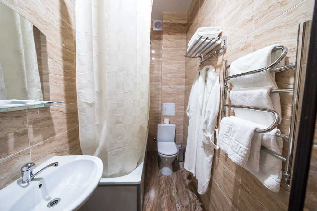 В номерах есть всё необходимое: полотенца, тапочки, косметические средства, стаканы, бутылка воды.