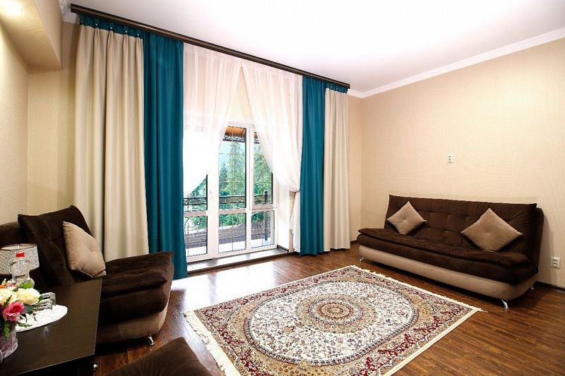 Диван и кресла раскладываются. Особенностью в этих номерах является объединенный балкон, позволяющий насладиться красивым видом. Номера данной категории с видом на поселок, канатную дорогу и вершину Мусса-Ачитара или на уютный внутренний двор отеля и вершину Белалакая.