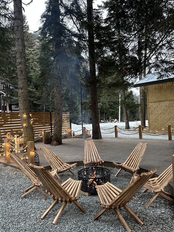 Уютный уголок с живым огнём, где можно собраться теплым кругом после активного дня.