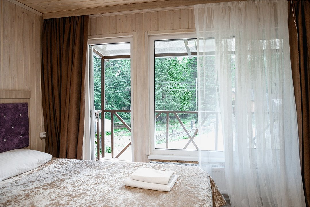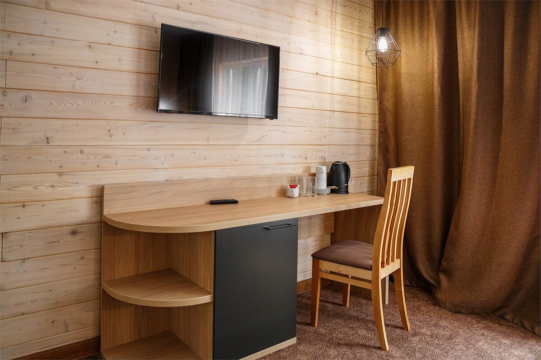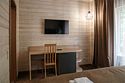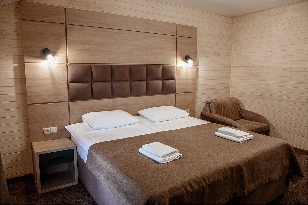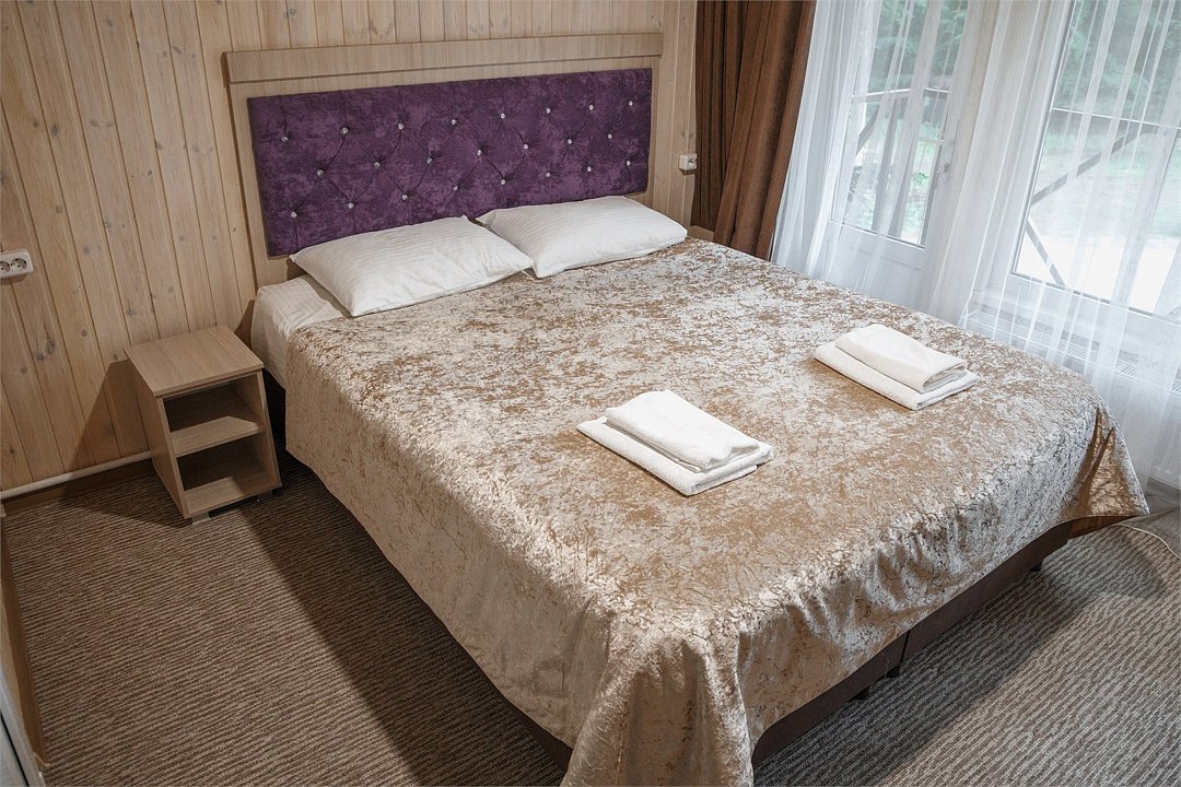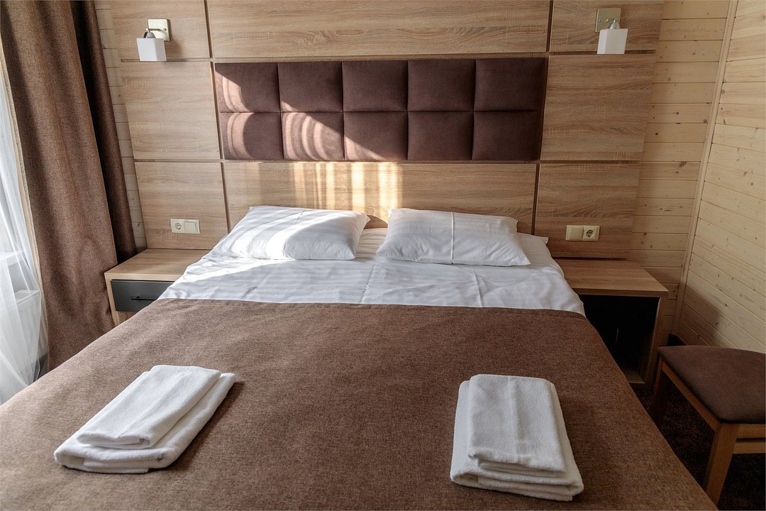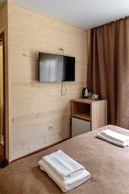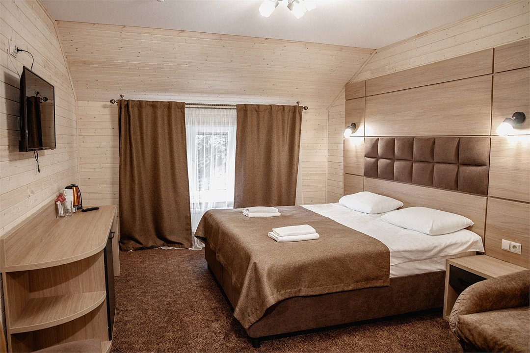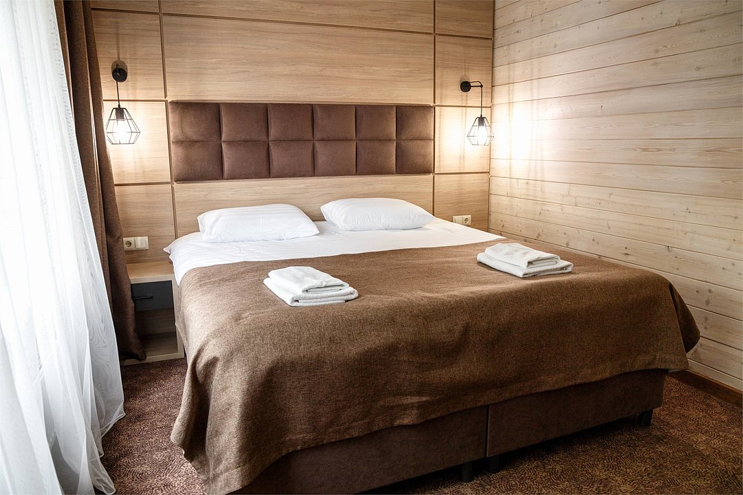 Wi-Fi, интернет, фен, электронные замки, теплый пол, банные полотенца, тапочки, гигиенические средства, кровать «King size», шкаф для одежды, вешалки, багажная тумба, зеркало, звуконепроницаемые стены и окна, набор посуды, чайник, питьевая вода, душ, стаканы, туалетные средства, цифровое тв, мини-холодильник, гостиничная парфюмерия, вид на горы, номер для некурящих, вид на лесВ гостиничном номере