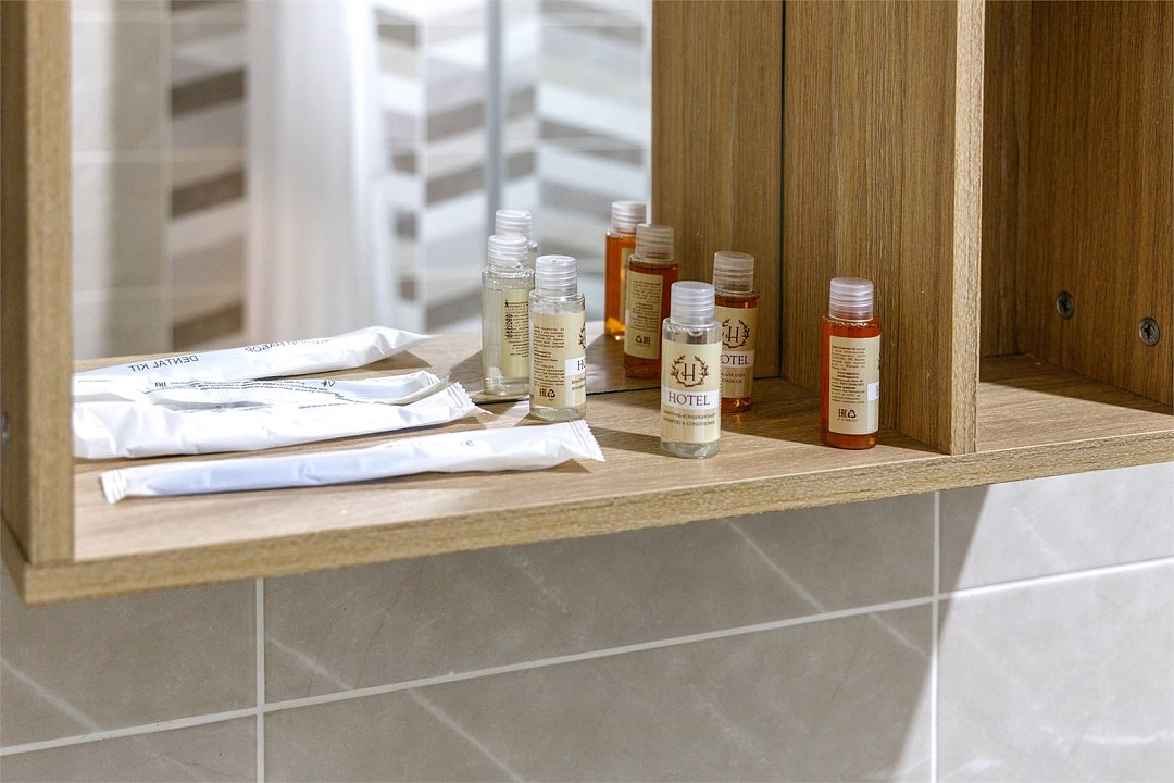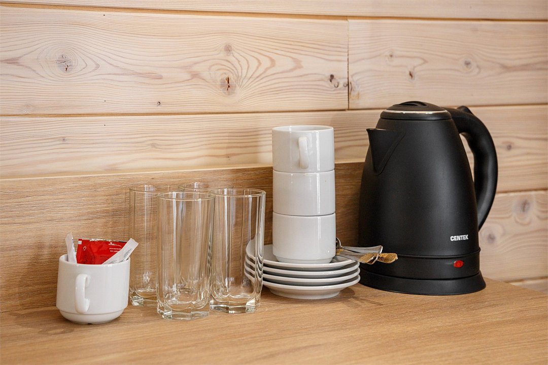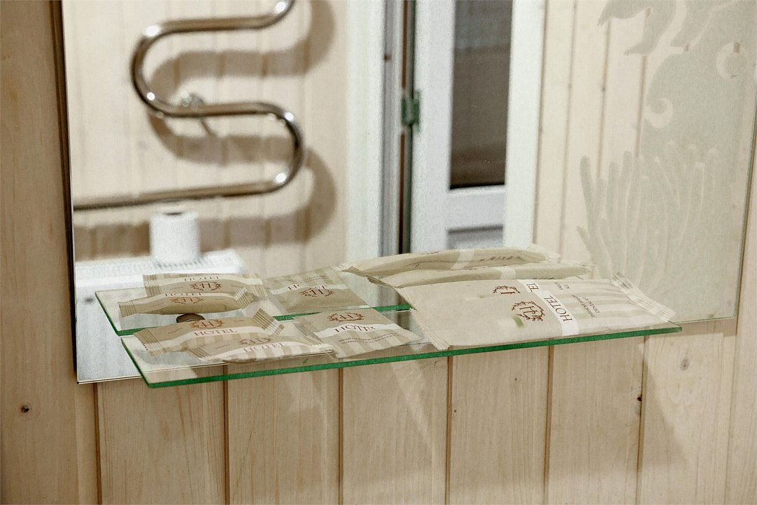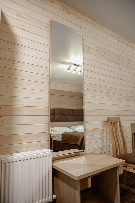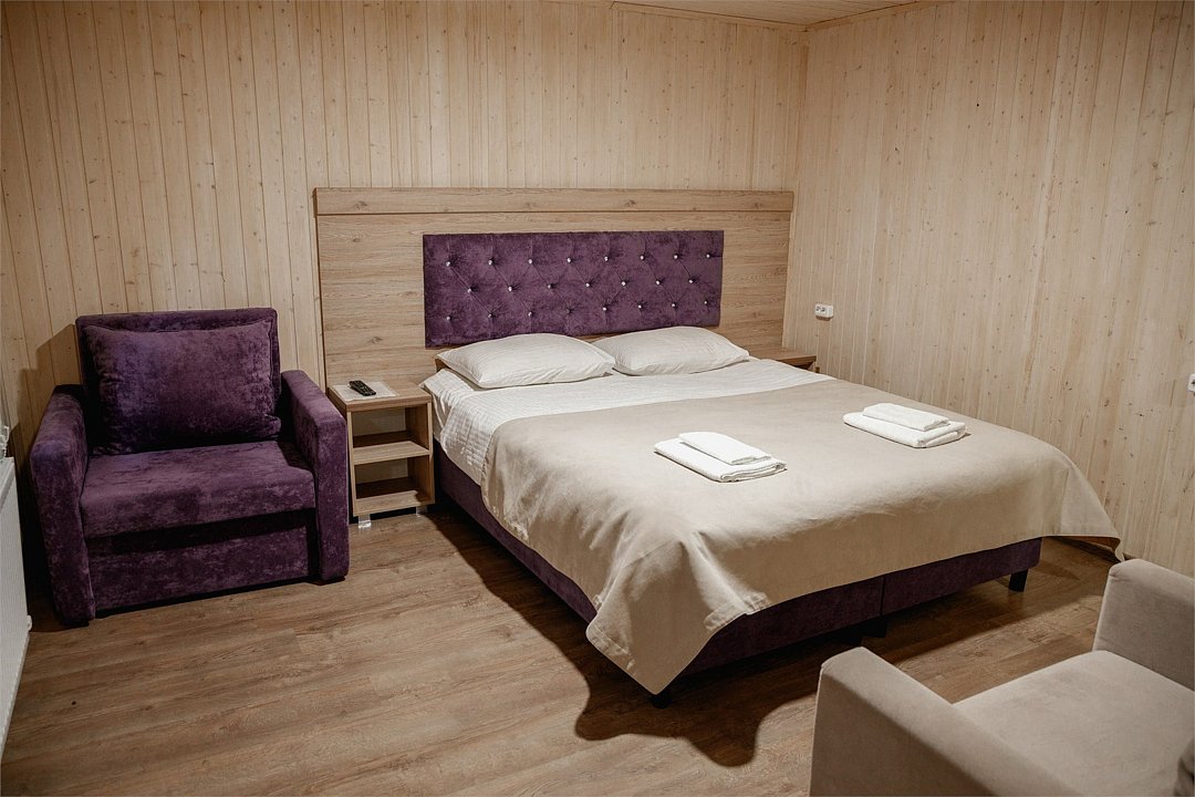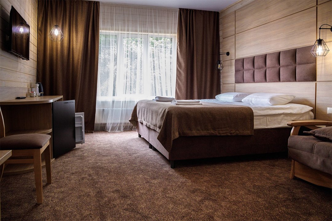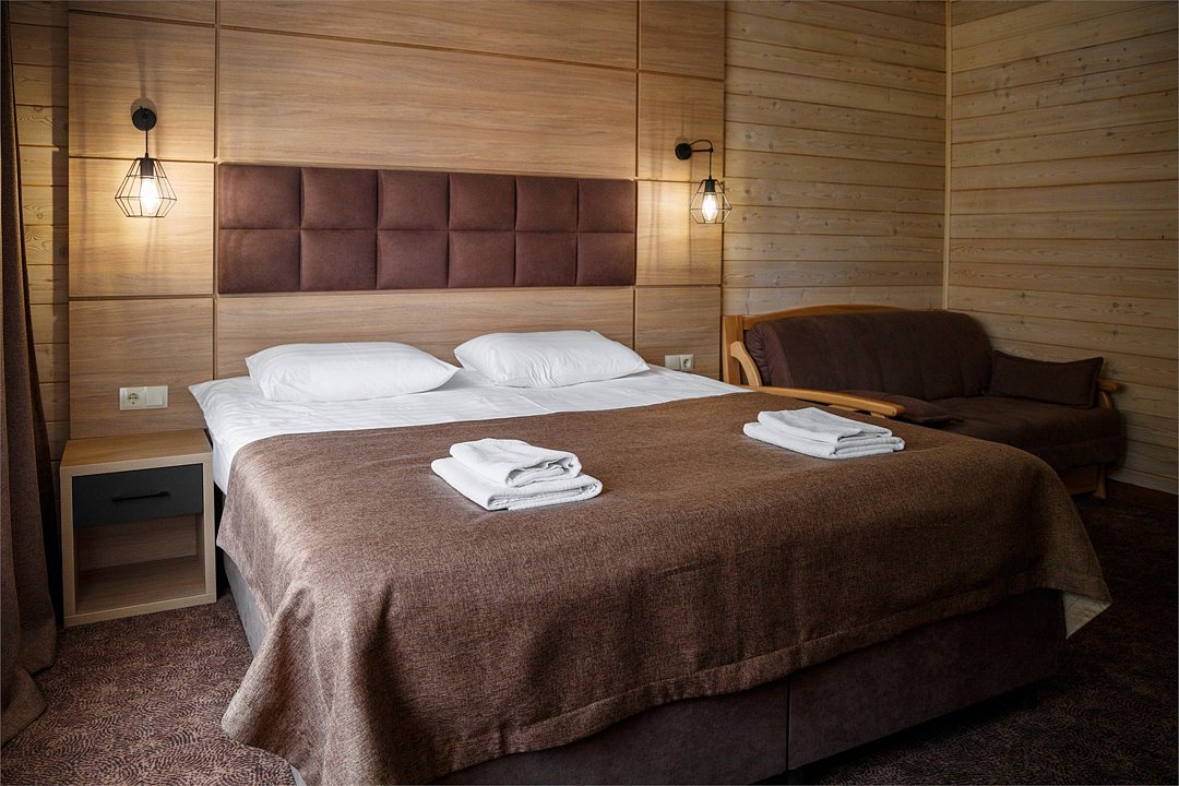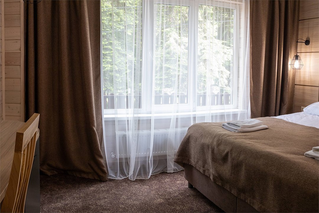 Wi-Fi, интернет, фен, электронные замки, теплый пол, банные полотенца, тапочки, гигиенические средства, кровать «King size», шкаф для одежды, вешалки, багажная тумба, зеркало, звуконепроницаемые стены и окна, набор посуды, чайник, питьевая вода, душ, стаканы, туалетные средства, цифровое тв, мини-холодильник, гостиничная парфюмерия, вид на горы, номер для некурящих, вид на лесВ гостиничном номере